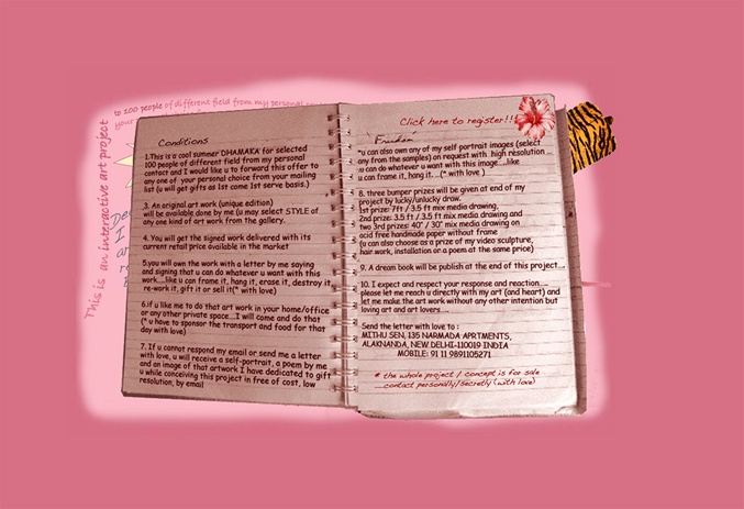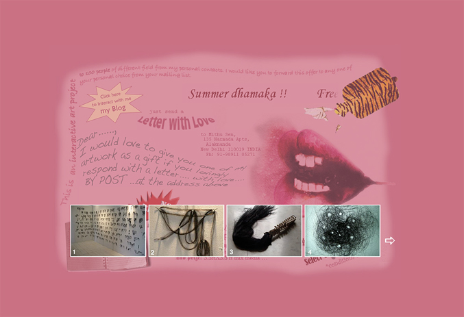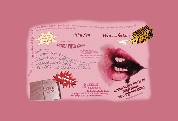 Initiated in 2007, Free Mithu started as an online invitation extended to friends, acquaintances and strangers. I asked them to send me a letter of love in exchange for a gift of an artwork I would present to them in the future. My intention was to open gaps where genuine intimate interaction could be performed between people around an artwork, away from the market driven culture that was heavily dictating formats of engagement between the artist, artworks and audiences. I was (un)lettered with sweaters, conversations in person over a lemon cake, diaries and much more. The former online format extended to a manifested space, where I performed Free Mithu at KHOJ in Delhi, India. This one the first of many tangible exhibitions, performances and interactions that have sprung from my engagement with this project.