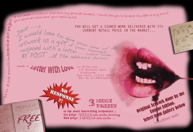 Over the last ten years Free Mithu has branched into additional interventions that I have initiated. It is in a constant state of (un)doing and (un)making. Although it continues in its original format where I am still making and sending artworks to those who sent me a letter of love, I am conceptually furthering the intention into new engagements every year. The artworks I give for charity auctions are a gesture to insert free gifts into the market, for the consumption of the buyers. My performances on radical hospitality echo the core philosophy of Free Mithu- offering something valuable and establishing alternative methods of consumption and exchange between people and myself- where the value is above what is apparent at the surface