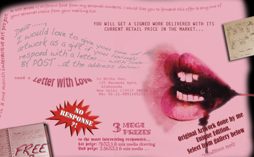 It is an on-going web based interactive project that offers people a free art work in exchange for a letter with love, as a form of counter capitalism, challenging and critiquing the conventions of art world exchange...