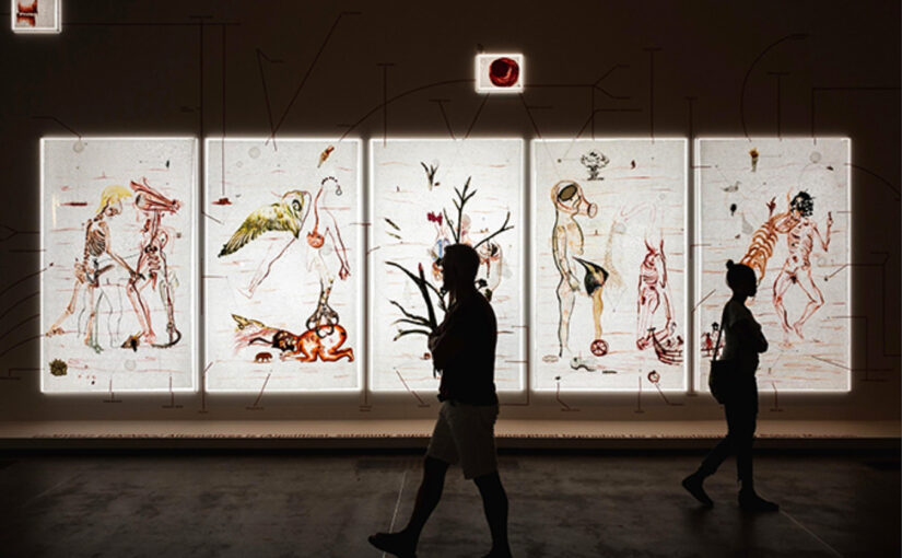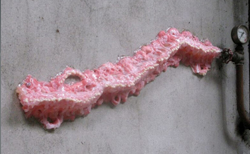 A fluid line of false teeth and dental polymer creates a monumental hanging visceral sculpture that spans eighty-four feet...divide the geometric Zaha Hadid space into two...