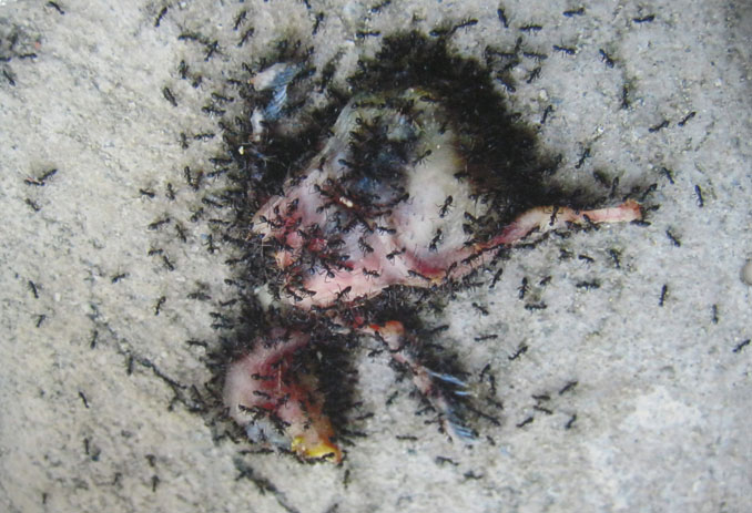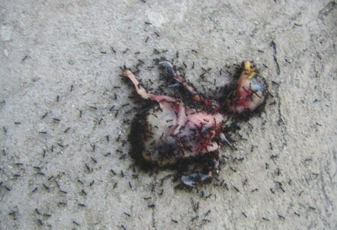 The tragic myth of Icarus, who died in a failed attempt to fly by gluing feathers to his arms; and the sorrowful death of the embryonic bird seen in the video. In the work, an army of ants gather around the dead bird in an attempt to lift it’s lifeless body. In the process, the ants make the unformed wings of the bird move in a mock flap.
