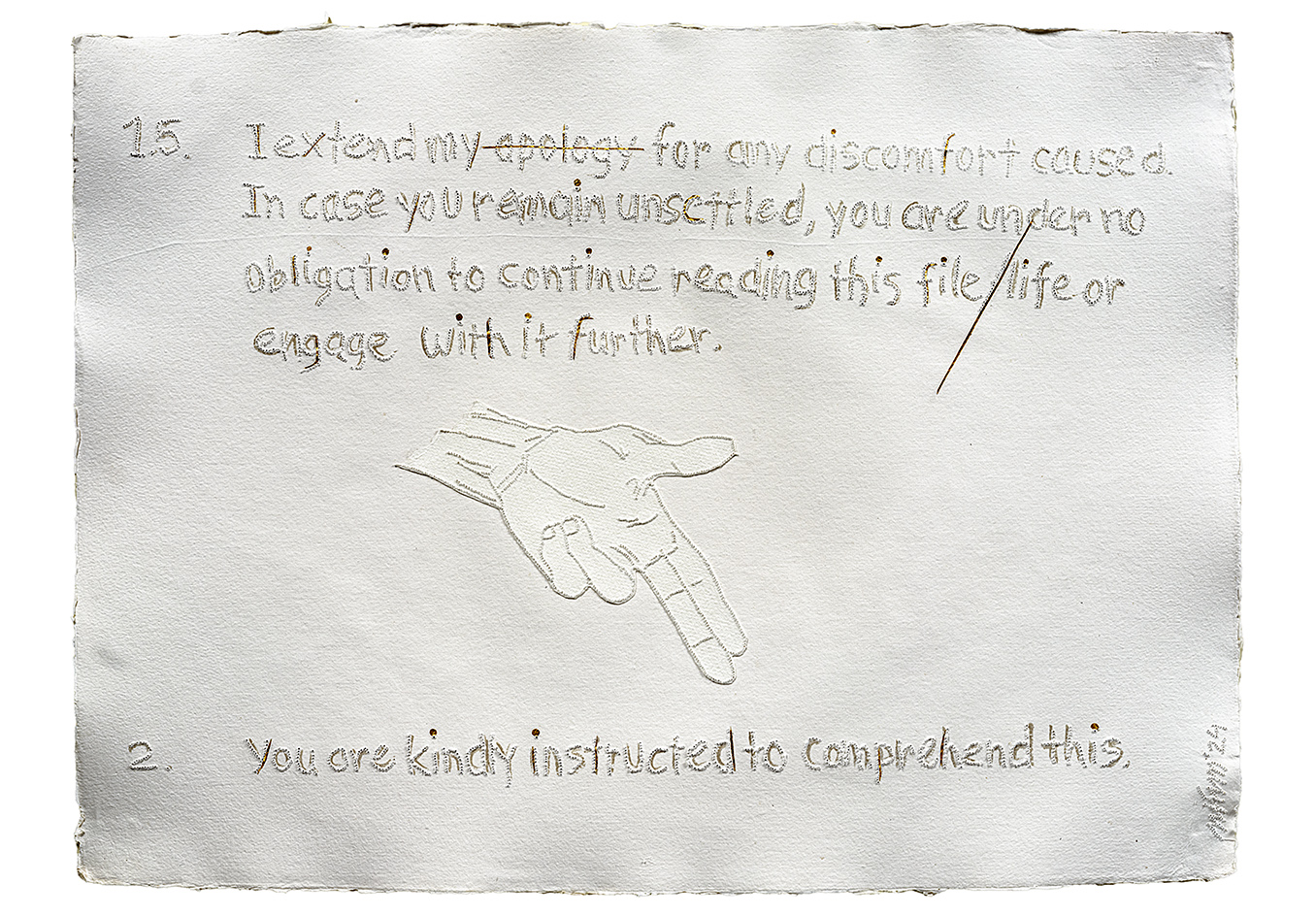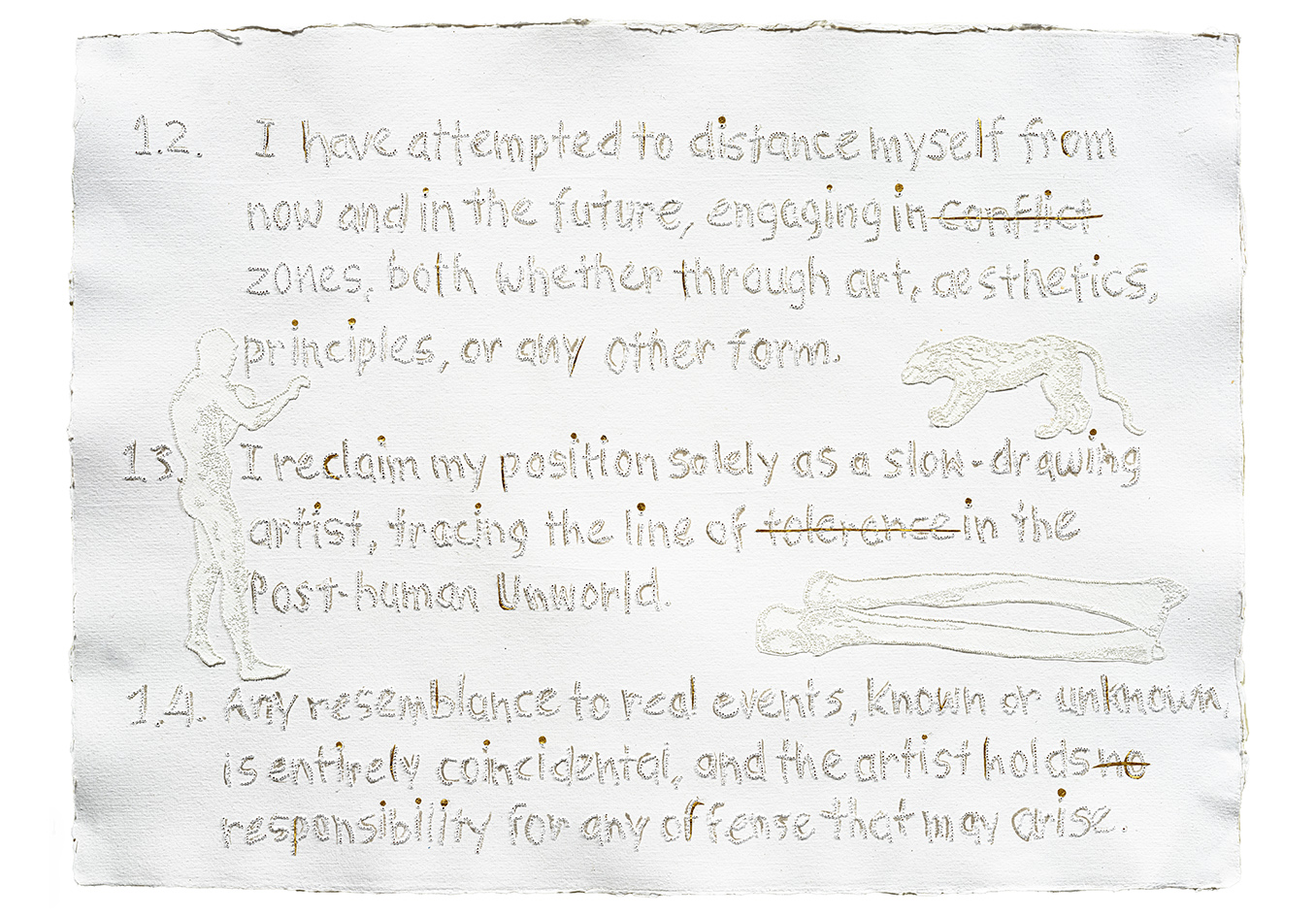 A strategic layout enhances its complexity, employing a mix of text, images, and video in a fluid, performative dialogue. The contractual declaration acts as both a legal framework and artistic provocation, contrasting bureaucratic language with the emotional weight of the exhibition. The tactile interplay of Unpoetry-text is used sparingly as a counter-script, strategically placed to create doubt and invite multiple interpretations