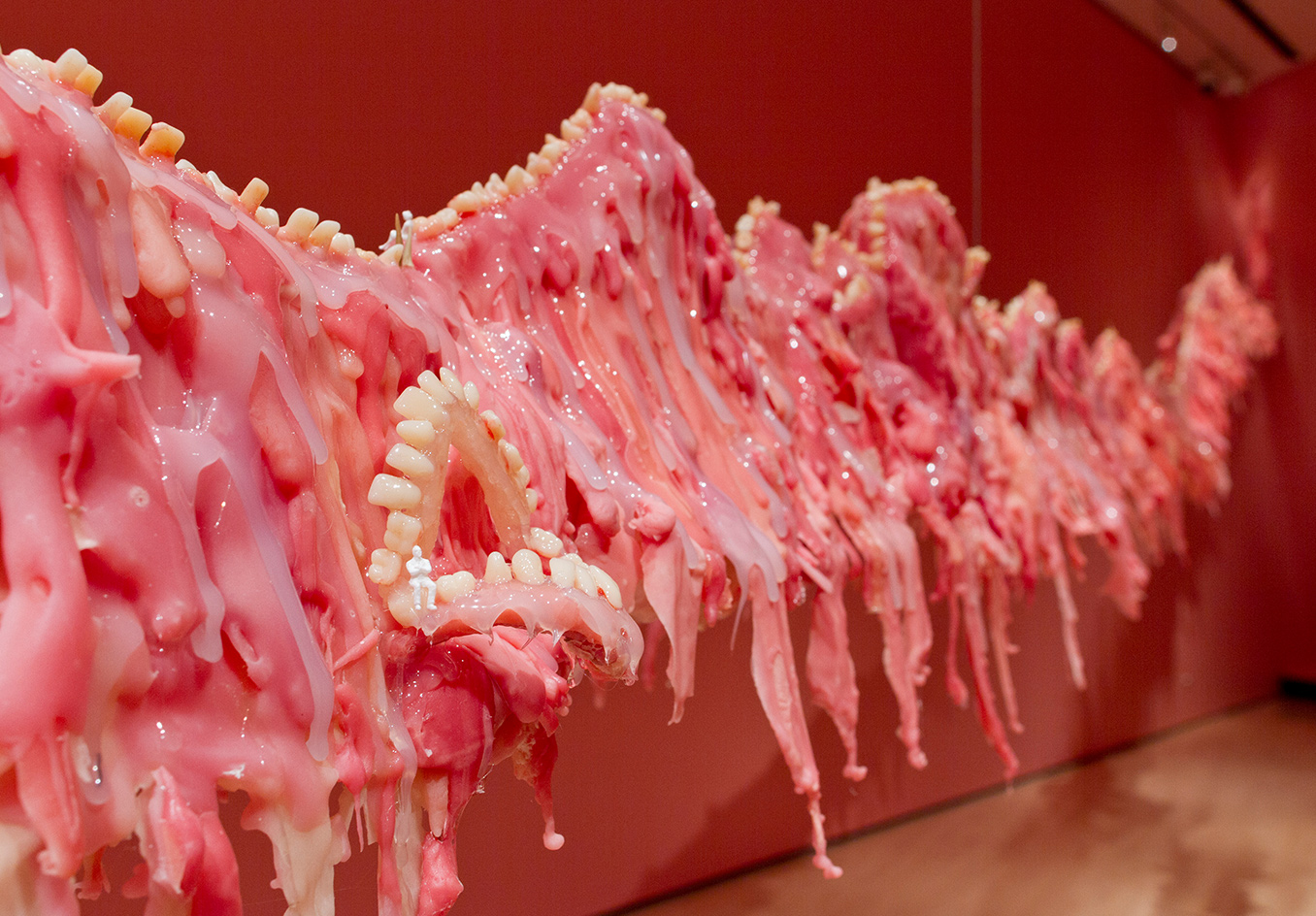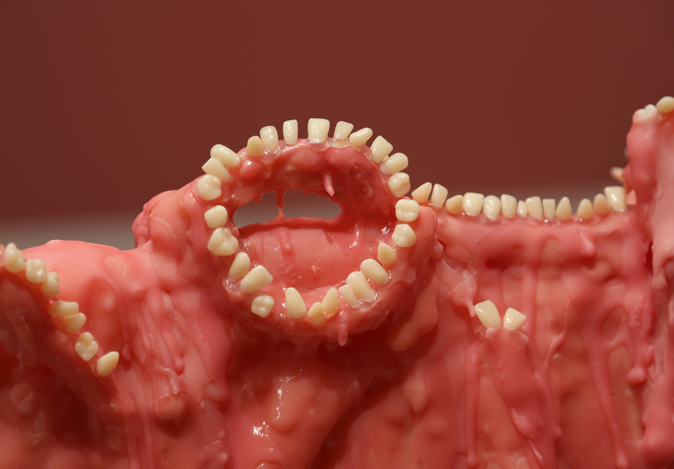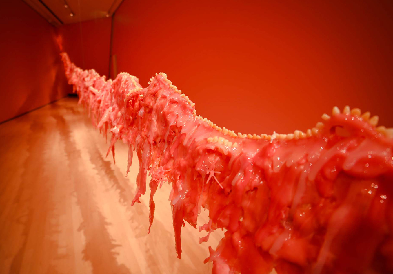 A visceral sculpture made of false teeth and dental polymer –spanning 84 feet extending from the ceiling to the gallery floor, cutting across the gallery’s geometric interior designed by Zaha Hadid.