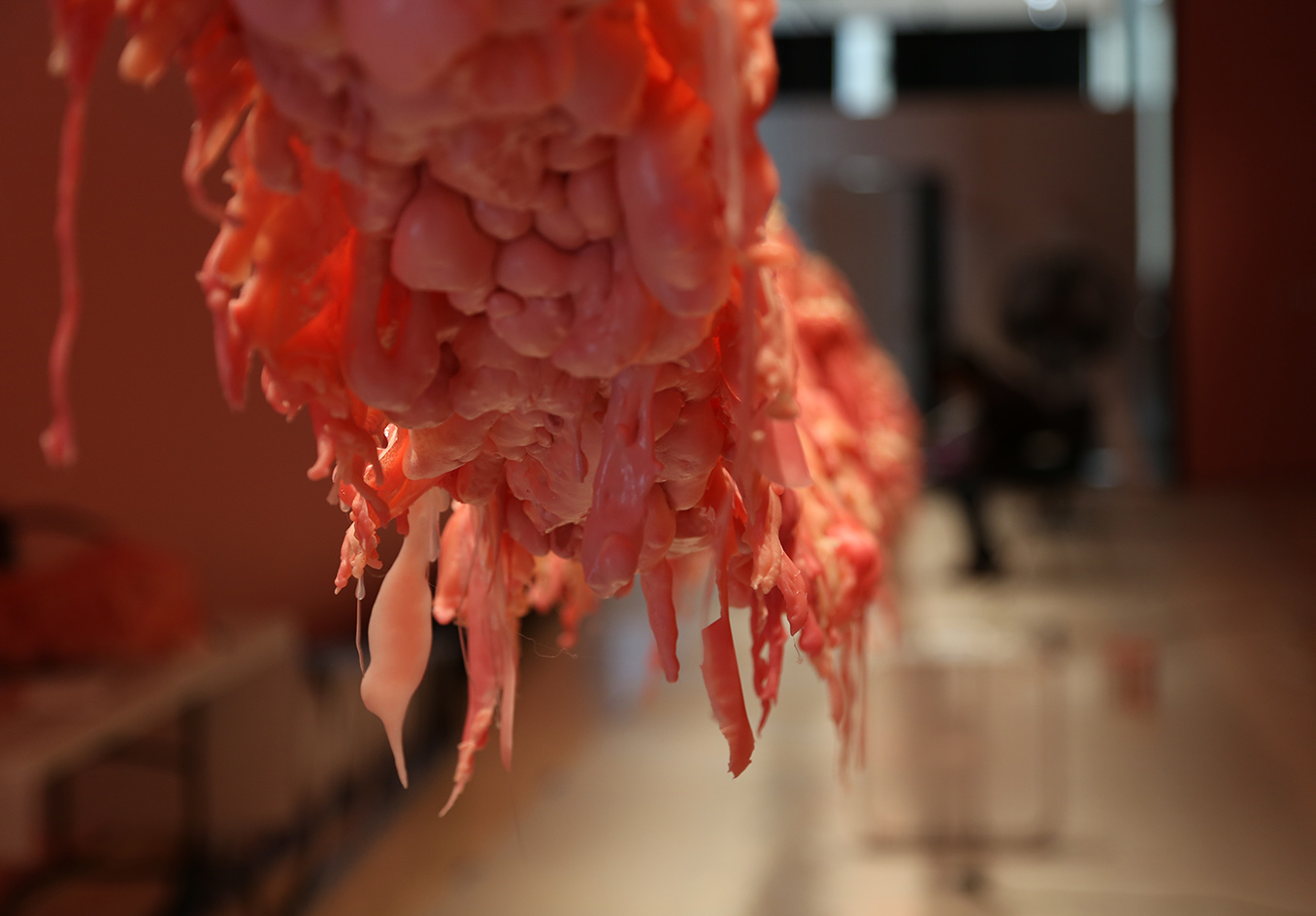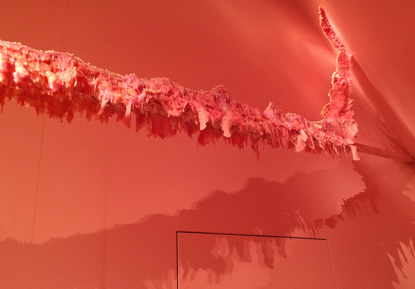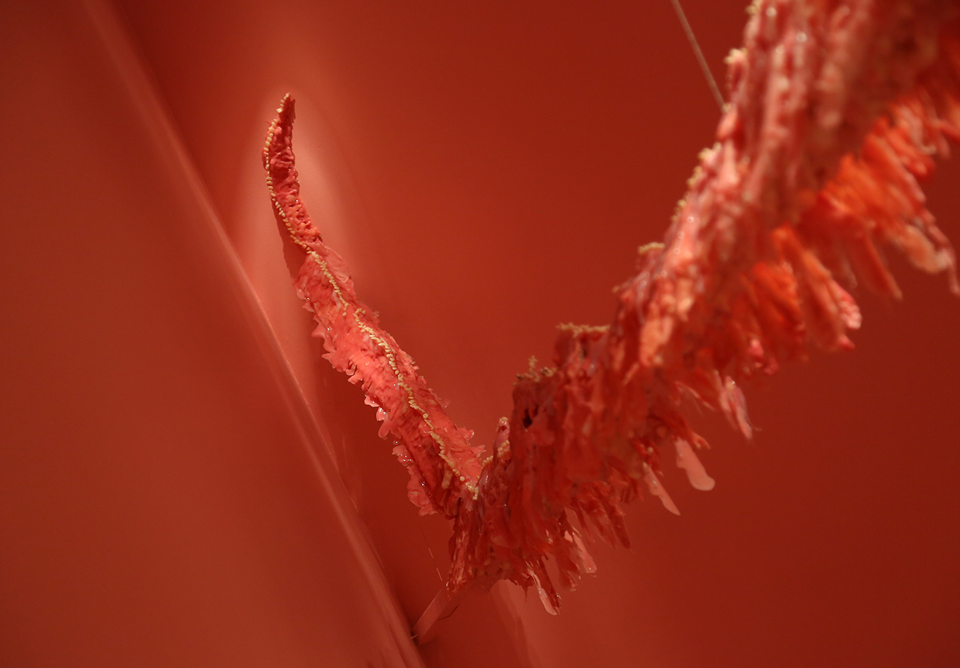 A visceral sculpture made of false teeth and dental polymer –spanning 84 feet extending from the ceiling to the gallery floor, cutting across the gallery’s geometric interior designed by Zaha Hadid.