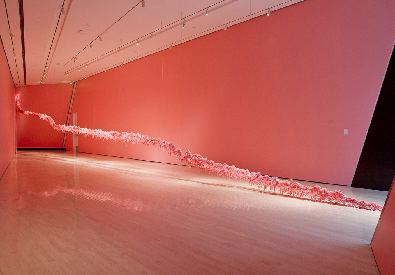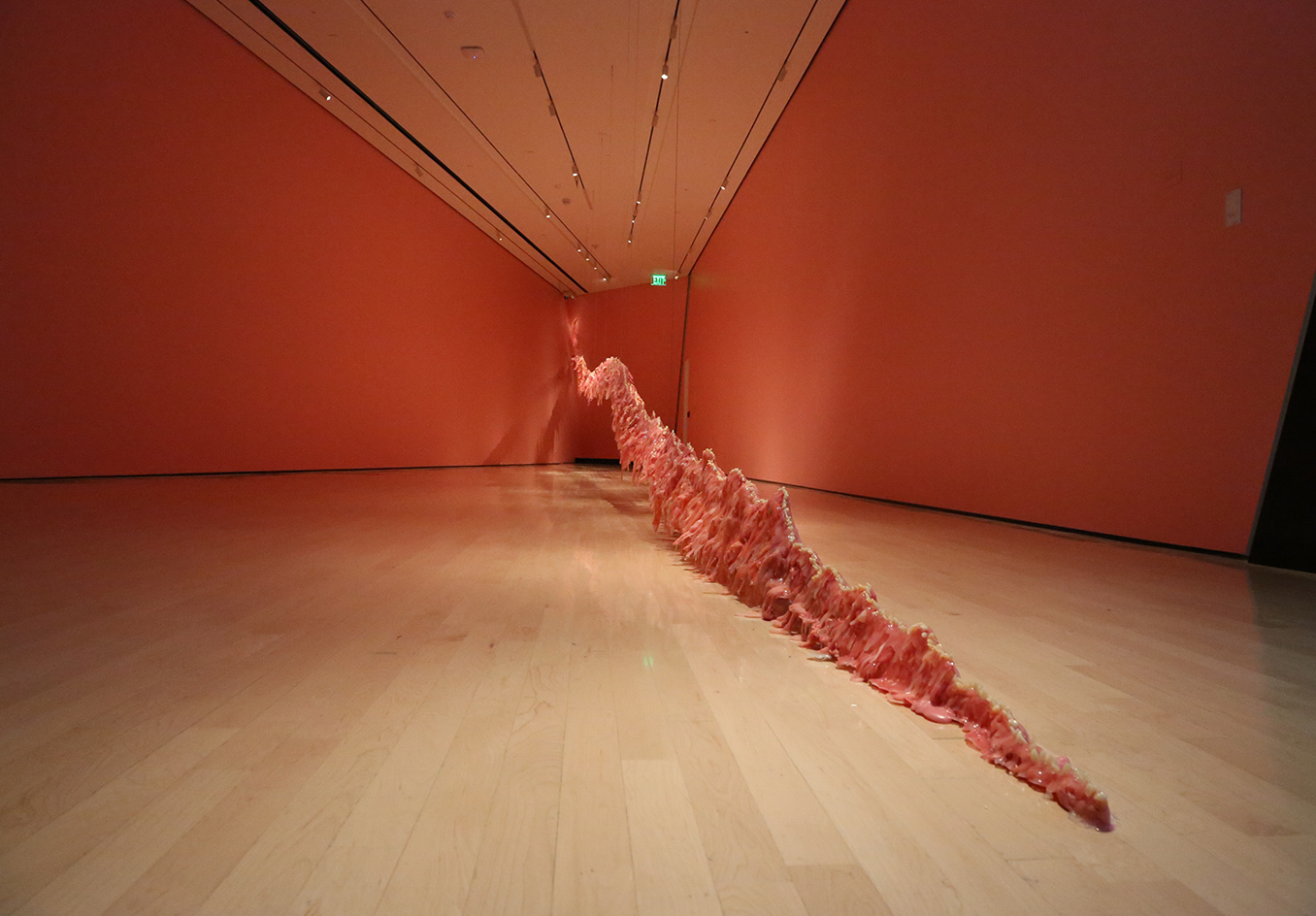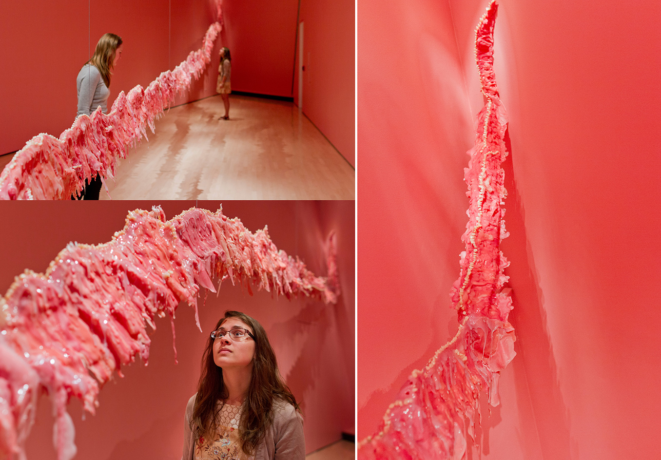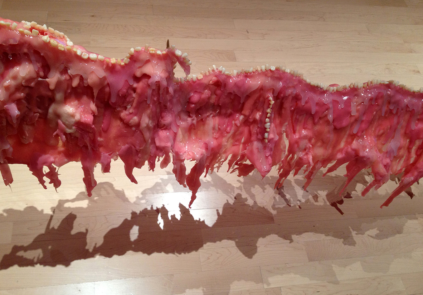 I created a fluid line of false teeth and dental polymer to manifest a monumental hanging visceral sculpture that spanned eighty-four feet, extending from the ceiling to the gallery floor. Drawing an organic and irregular line through the prism-shaped complex geometries of the museum’s over powering Zaha Hadid-designed building, the work simultaneously evokes the human spine and an industrial beam, exposing the subtleties of power.