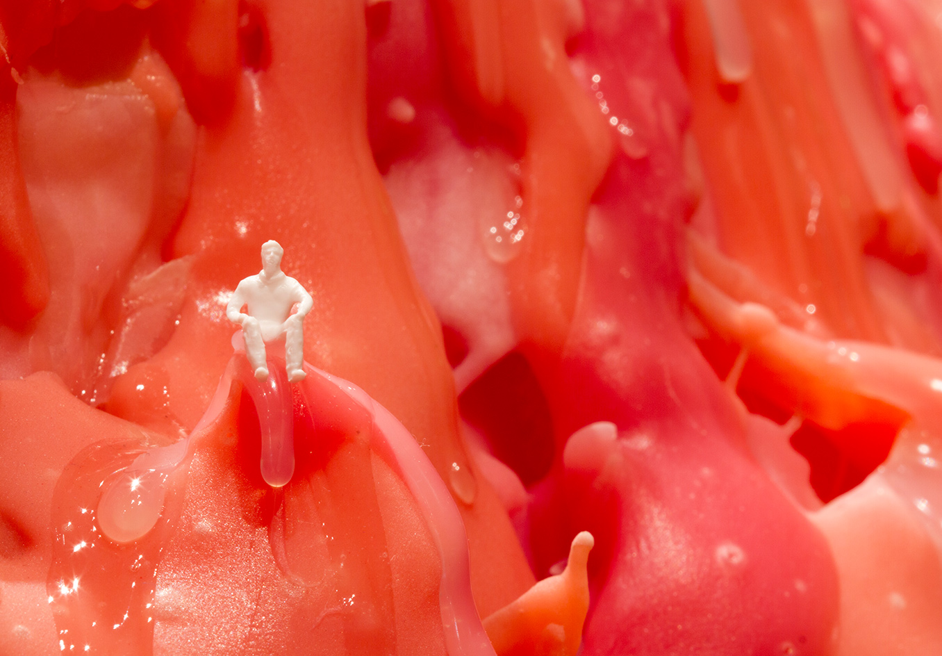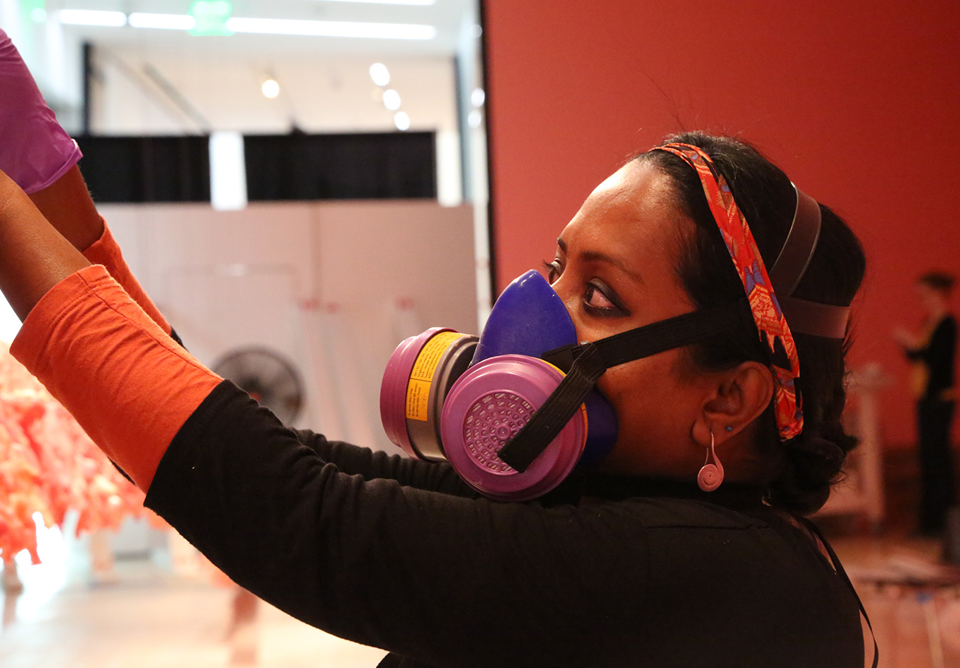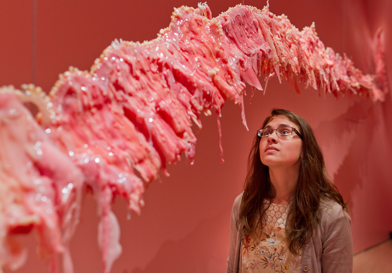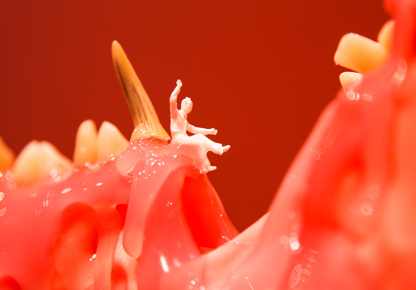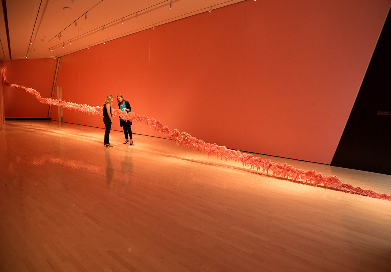 I created a fluid line of false teeth and dental polymer to manifest a monumental hanging visceral sculpture that spanned eighty-four feet, extending from the ceiling to the gallery floor. Drawing an organic and irregular line through the prism-shaped complex geometries of the museum’s over powering Zaha Hadid-designed building, the work simultaneously evokes the human spine and an industrial beam, exposing the subtleties of power.