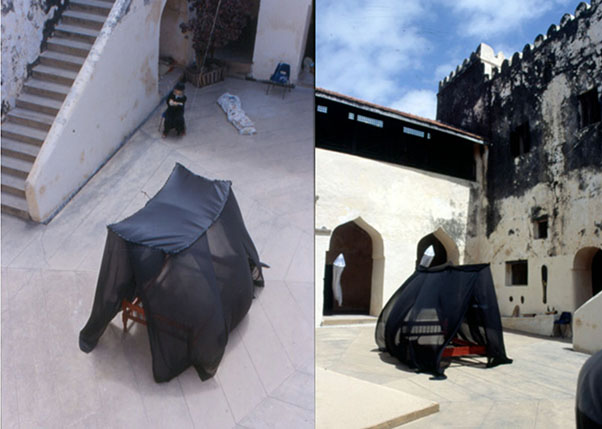 The installation explored the veils’ meaning in the local community. It consisted of black veil material stitched into a large tent-like enclosure with 6 panel doors (3mtr /1mtr) inscribed by burnt marks of a poem on women’s desire. The 3 meter long veil suggests a cover of a body as well as a cover of a bed with a double bed laid within its folds. Installed in the courtyard of the Lamu Fort, the black veil billowed in the wind suggested the turbulence that may have occurred in the private space of the bedroom.