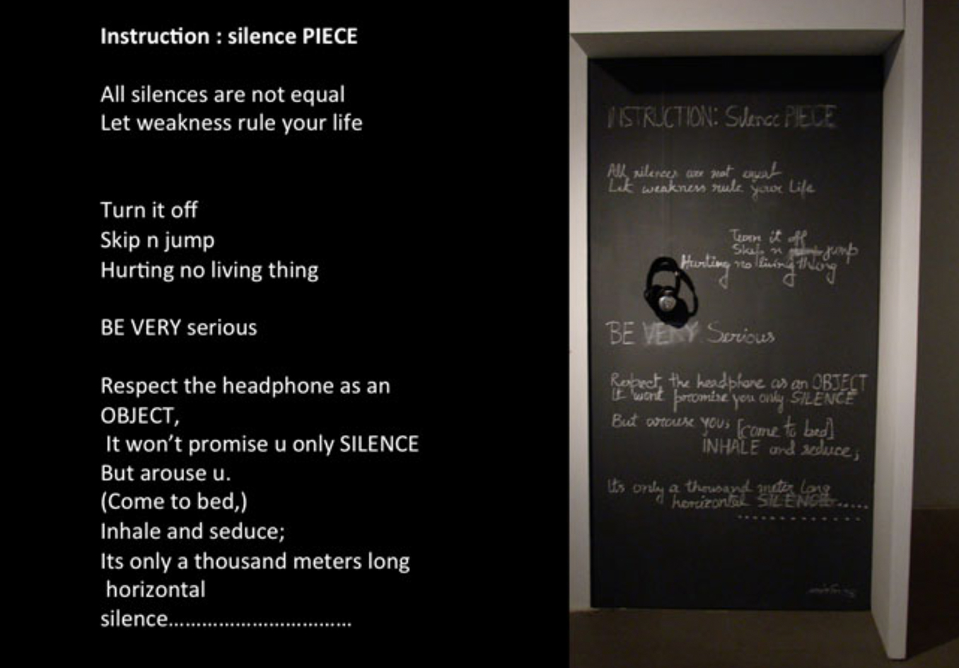Asking the audience to shut off their hearing senses, placed them in a transient vacuum away from the noise filled gallery space.