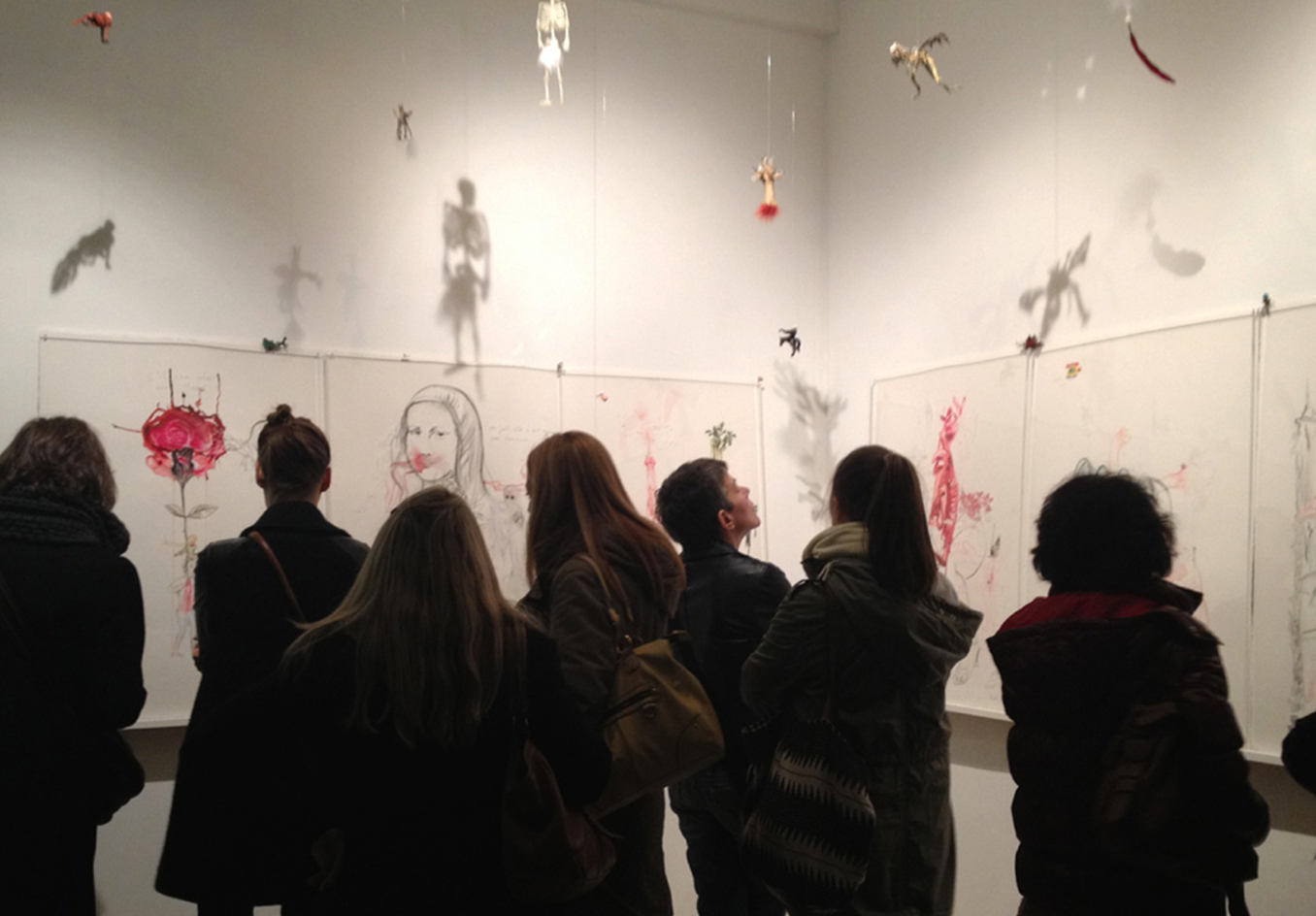 Devoid is a void after there has been a presence.The appearing and disappearing drawings confronted the ideas of permanence, denoting existence, non-existence and co-existence- A kind of non-visual communication through the negative spaces. The viewer in this way formed a dynamic support for the shadows, and became a mobile actor of these active forces.