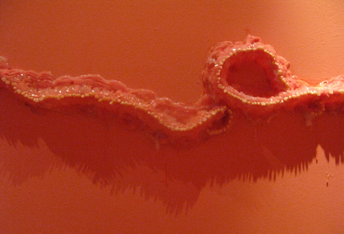 The teeth sculptures personify the inanimate blank gallery walls. They speak of biting incarcerations, of warped sexuality, and bleeding violence. They are like crawling life through bleak ruins. The show evoked the physical as well as the sexual acts associated with the teeth.