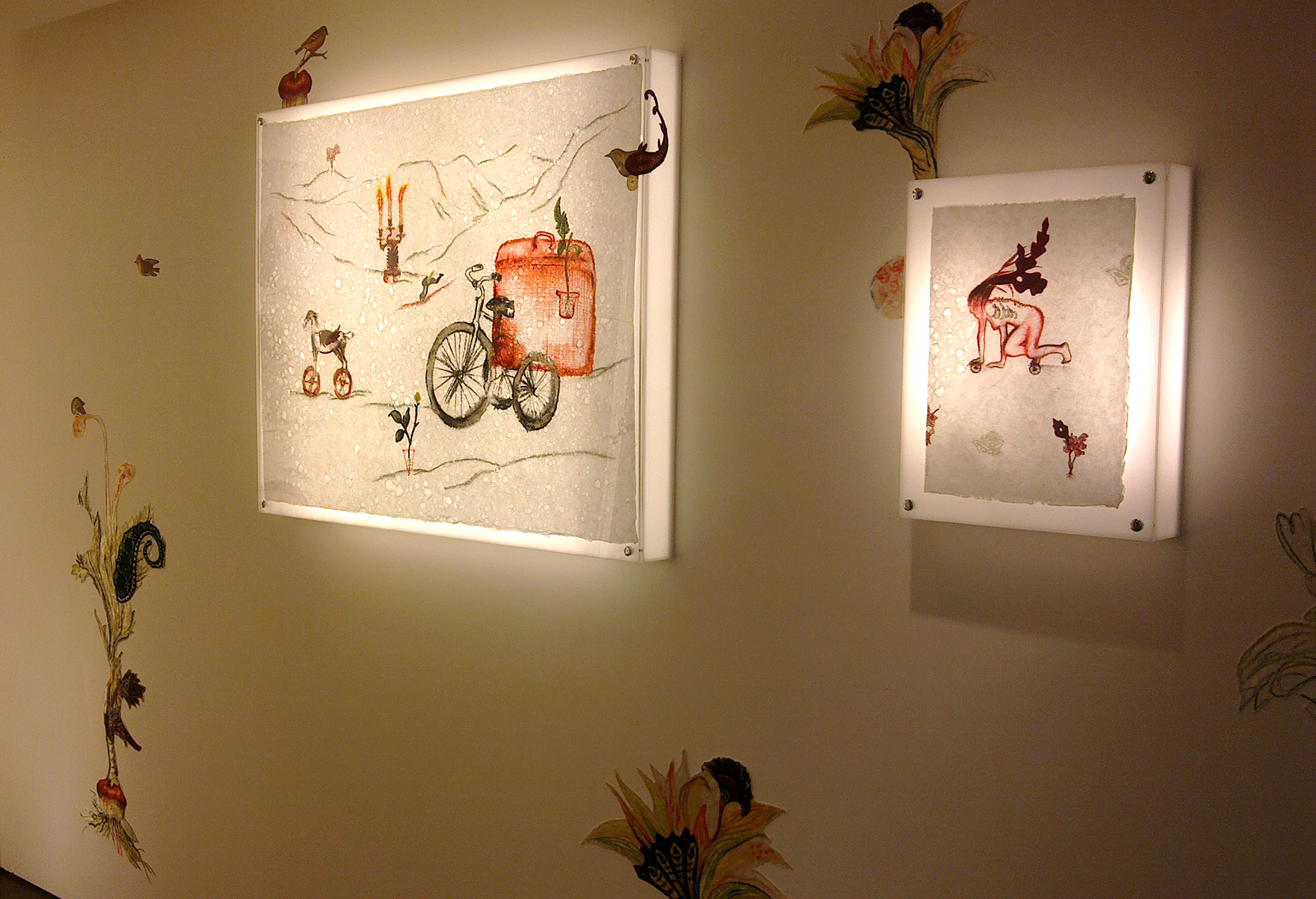 Mixed media watercolor drawings on Japanese Kozo paper in lightboxes