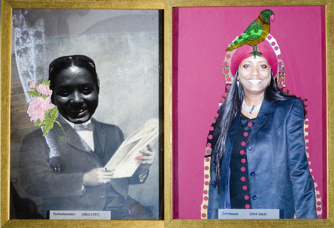 realising/ finding/discovering herself as part of her work. Old traditional Bengali novel names and surreal imaginative time period put next to each character generated a conflict between different realities. Finally, hanging them on high and low pedestal with less light created an unpredictable dramatic atmosphere.