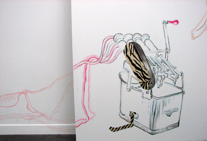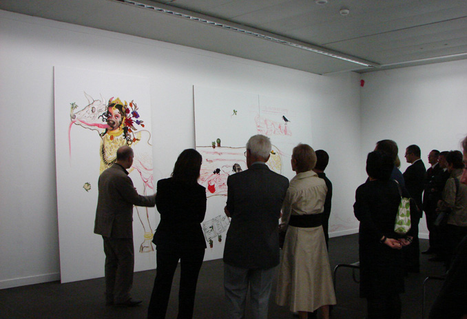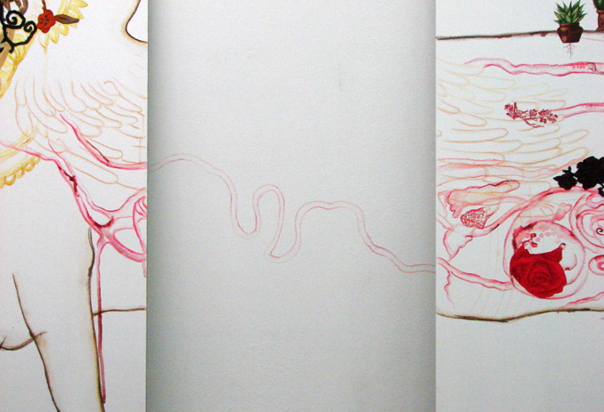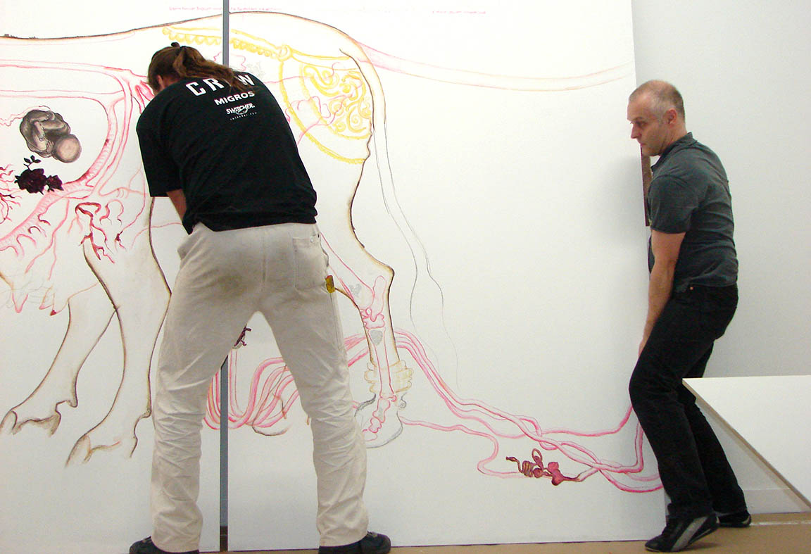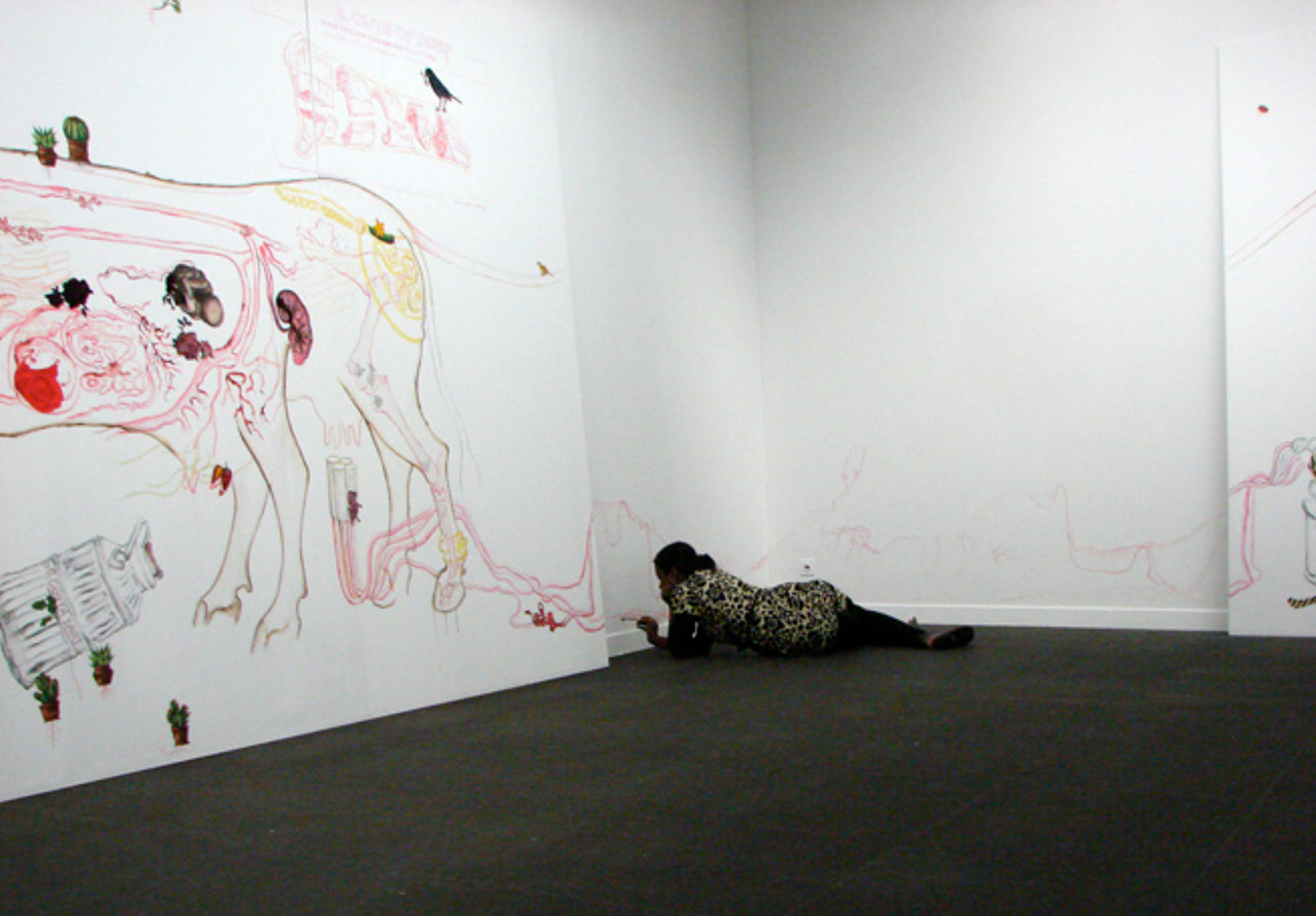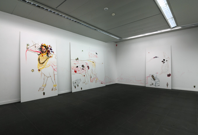 Kamdhenu is considered the god of desire. In this work, the central figure has six legs (instead of four) with the composition divided into four panels and an extended wall drawing. Kamdhenu’s identity is broken and restructured to present an alarming reality marked by hypocrisy and the urgent need for the creation of a popular identity in order to feel a sense of cultural agency.