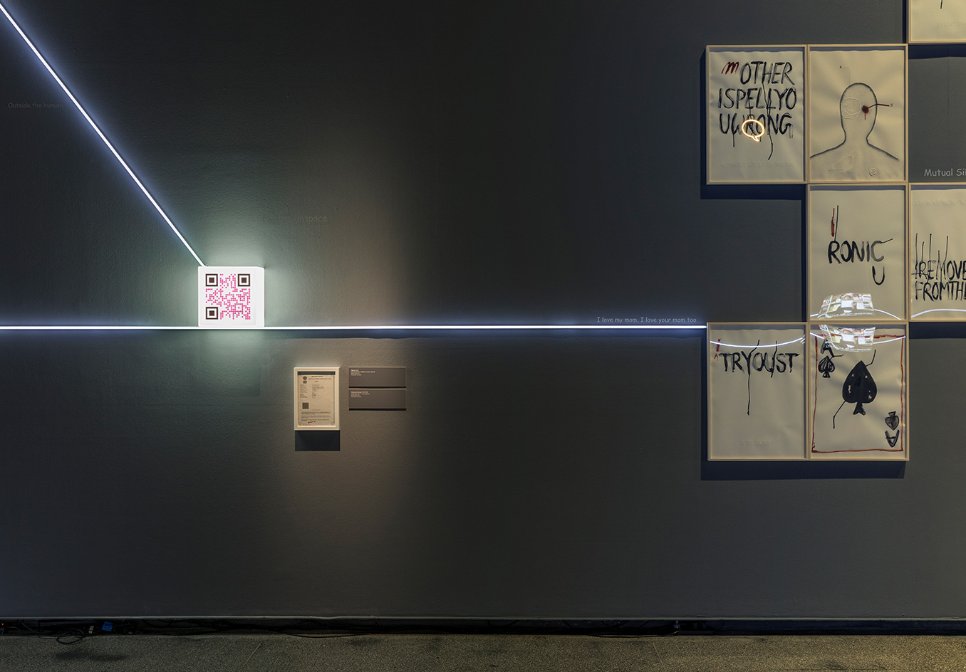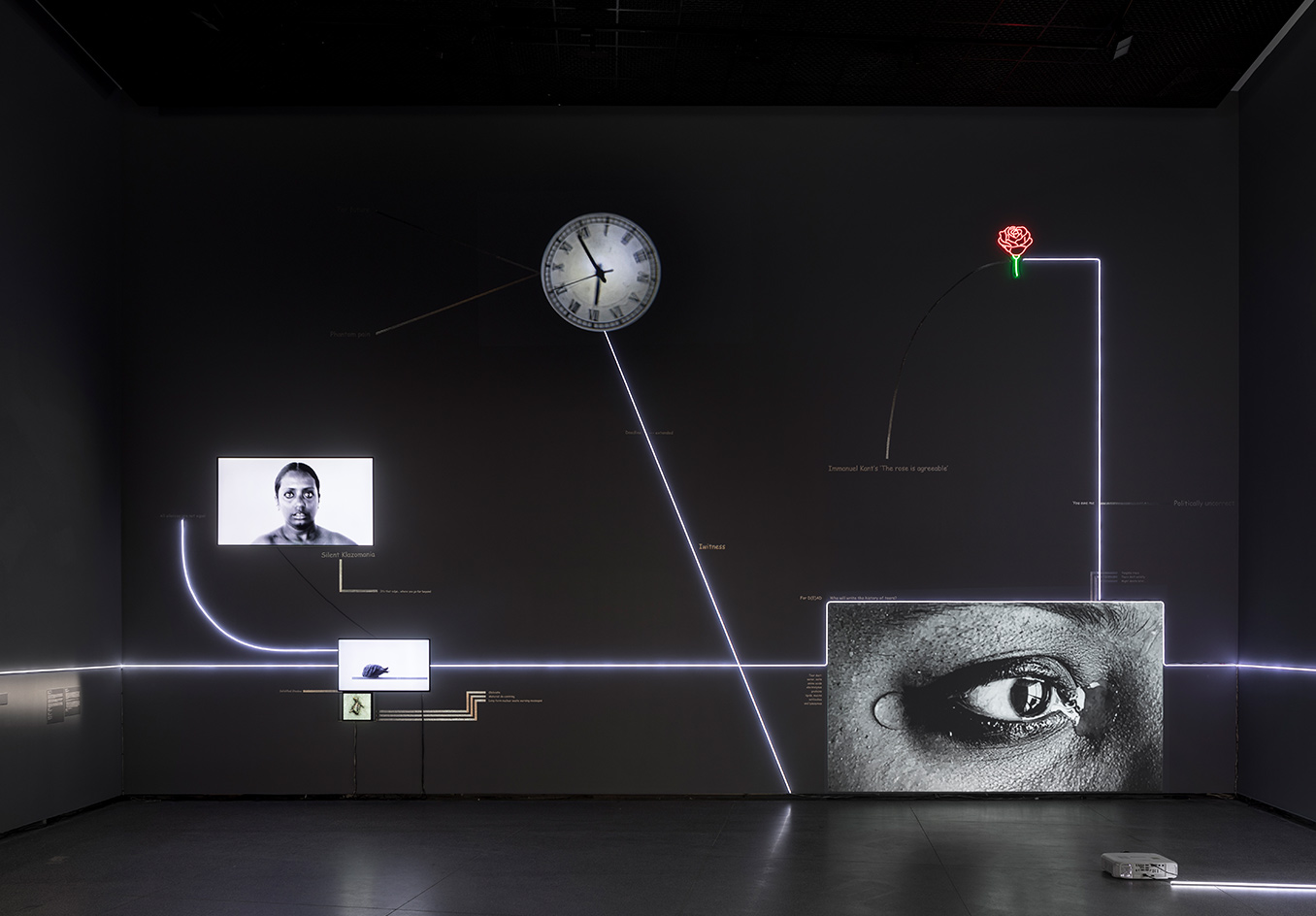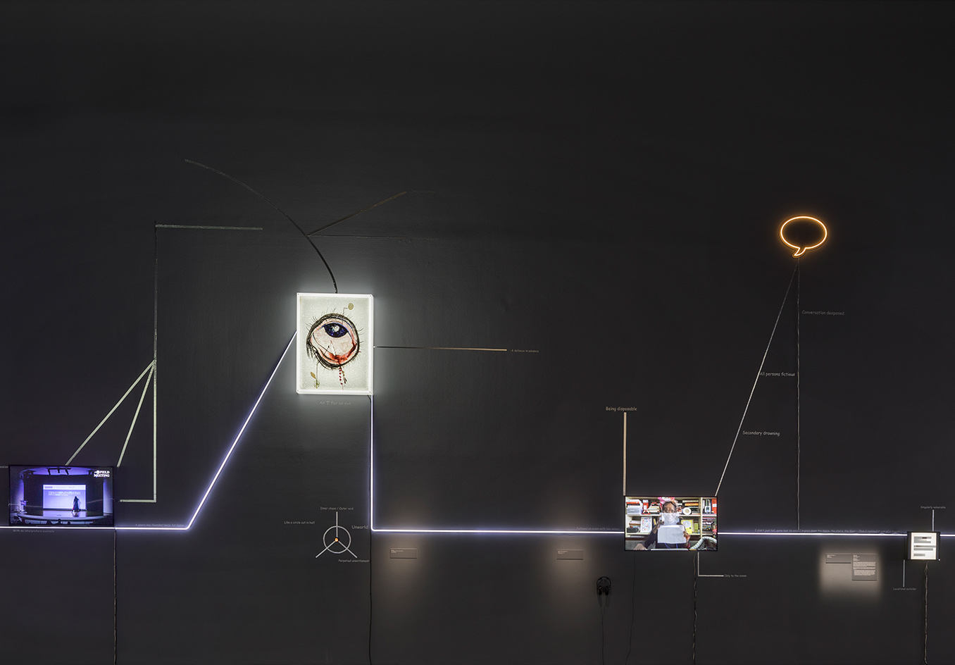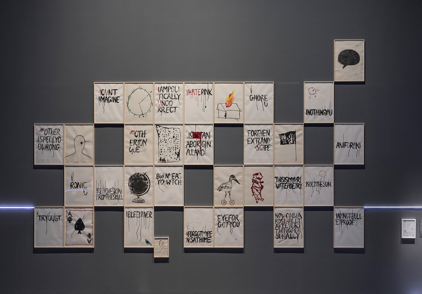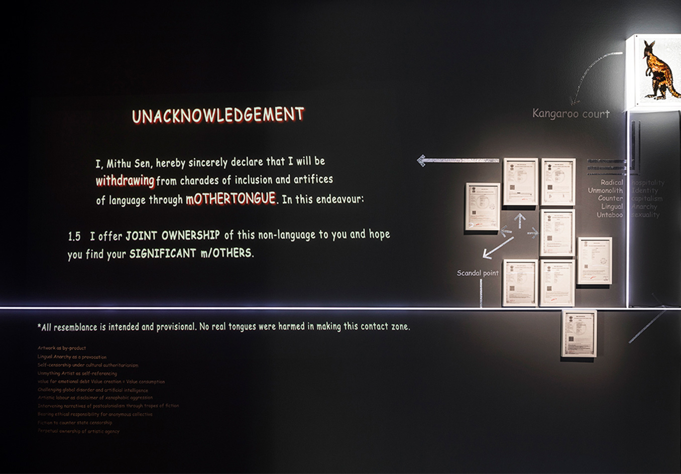 mOTHERTONGUE surveys the past two decades of Mithu Sen’s compelling art practice, including a series of major new installations. The exhibition is presented as an illuminated mind-map. As a constellation of image and word associations which move between visible surfaces and interior states, mOTHERTONGUE charts the ways in which language is channelled into forms as diverse as drawing, sculpture, media and performance to create complex artworks which elude definitional categories, institutional power structures and imposed identities related to race, gender, ethnicity and location.