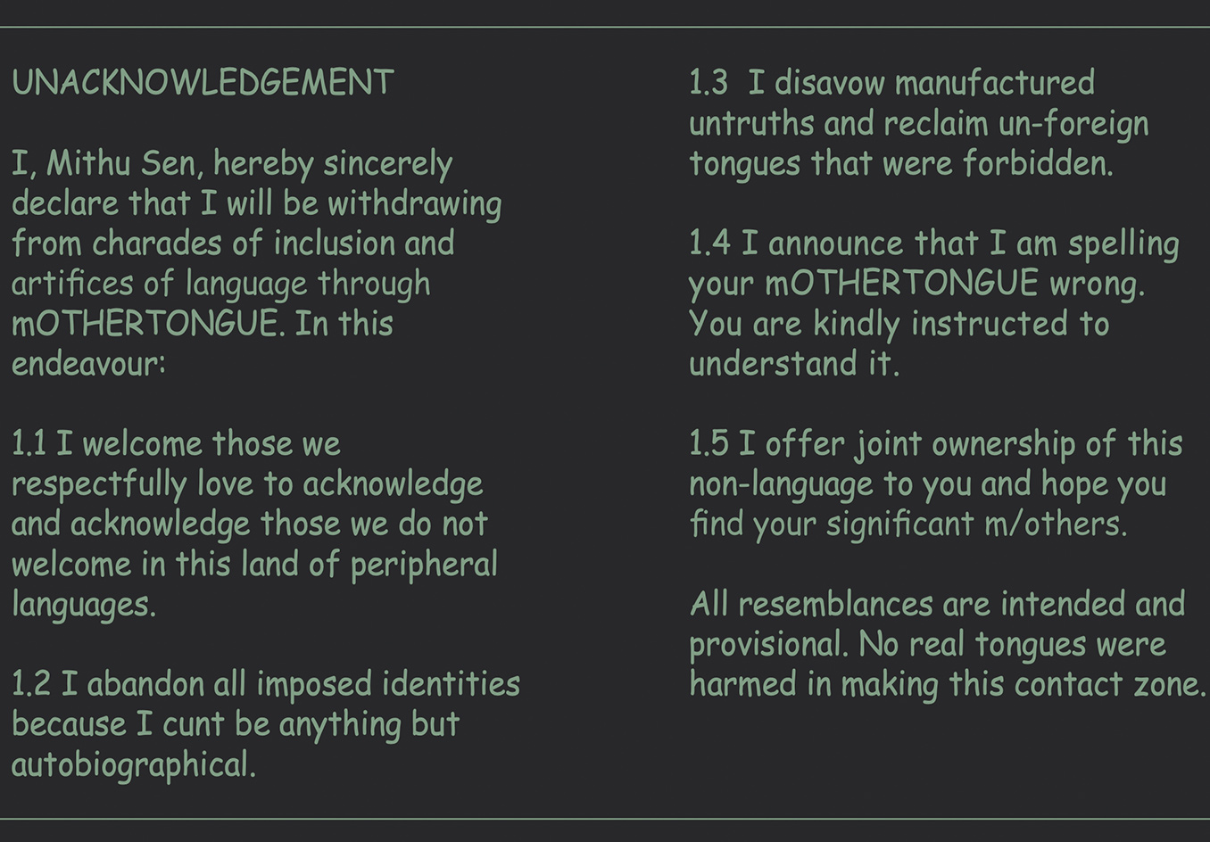 Situated around the conceptual categories of ‘lingual anarchy, unmonolith identity, untaboo sexuality, counter-capitalism and radical hospitality’, Mithu Sen’s practice occupies both intellectual and emotional registers – at once sensual, intimate and libidinous, whilst equally conceptual, critical and subversive. In the visual, linguistic and performative multiverse of Mithu Sen’s practice, her artistic gestures are offered with the promise of radical hospitality in ‘an attempt to bring in the complex, the marginalised and the invisible across quantum spaces and multiple realities’.