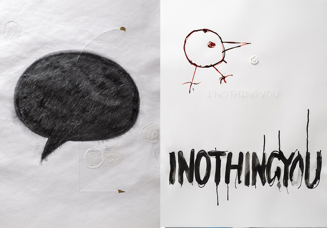 The synthesis of text and image in this artwork merges collisions between words and sentences, sound and vision. Using red and black ink on paper, the artist creates a sensory experience, as words and images stain and bleed, distorting their supports. The declarative, first-person mode of address allows for freedom of expression without being confined to identity webs. The linguistic corruptions, indicating alienation from anglophone norms, showcase the artists 'lingual anarchy,' offering fresh perspectives. As language is compromised, the artist explores the threat of the Other, aiming to conjure othered identities within genders, ethnicities, and cultures, navigating a space beyond governance and reasoning.