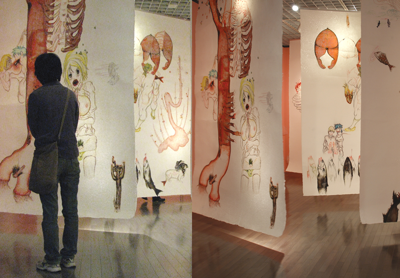 A series of monumental drawings developed from the exotic, erotic, and neurotic popular Japanese (porno)graphic Manga comic characters blew into a surreal, out of proportion public overdose to facilitate a dialogue between the subculture of erotica and desire and the dominant projection of Japan’s homogeneous and upright values .
