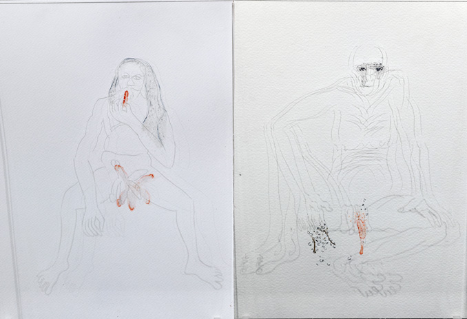A closed room occupied by engraved re-workings of Bhupen Khakhar’s tender drawings as casted shadows juxtaposed onto water colour landscapes revisiting his work through a lens of death and desire. Bhupen’s erotic homosexual images, autobiographical in nature, mocked the ideologically ingrained homophobia challenging the taboos of contemporary Indian society.