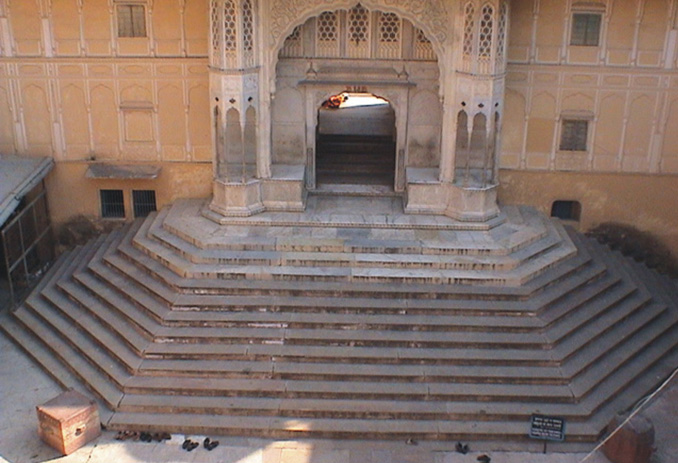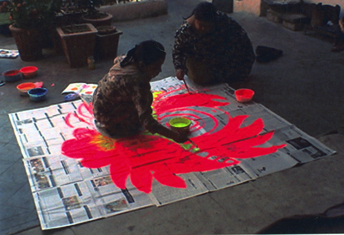 I worked with two Muslim sisters, Famida and Anisha. For them working in a public space in itself was a challenge, as in traditional Muslim society women are rarely seen unveiled outside the home. The public walked over the covered entrance steps to enter the temple, creating a statement against separated religious systems. As Muslim and Hindu artists blended opposing religious symbols within a sacred site, a moment of unity was established in a city with many differences.