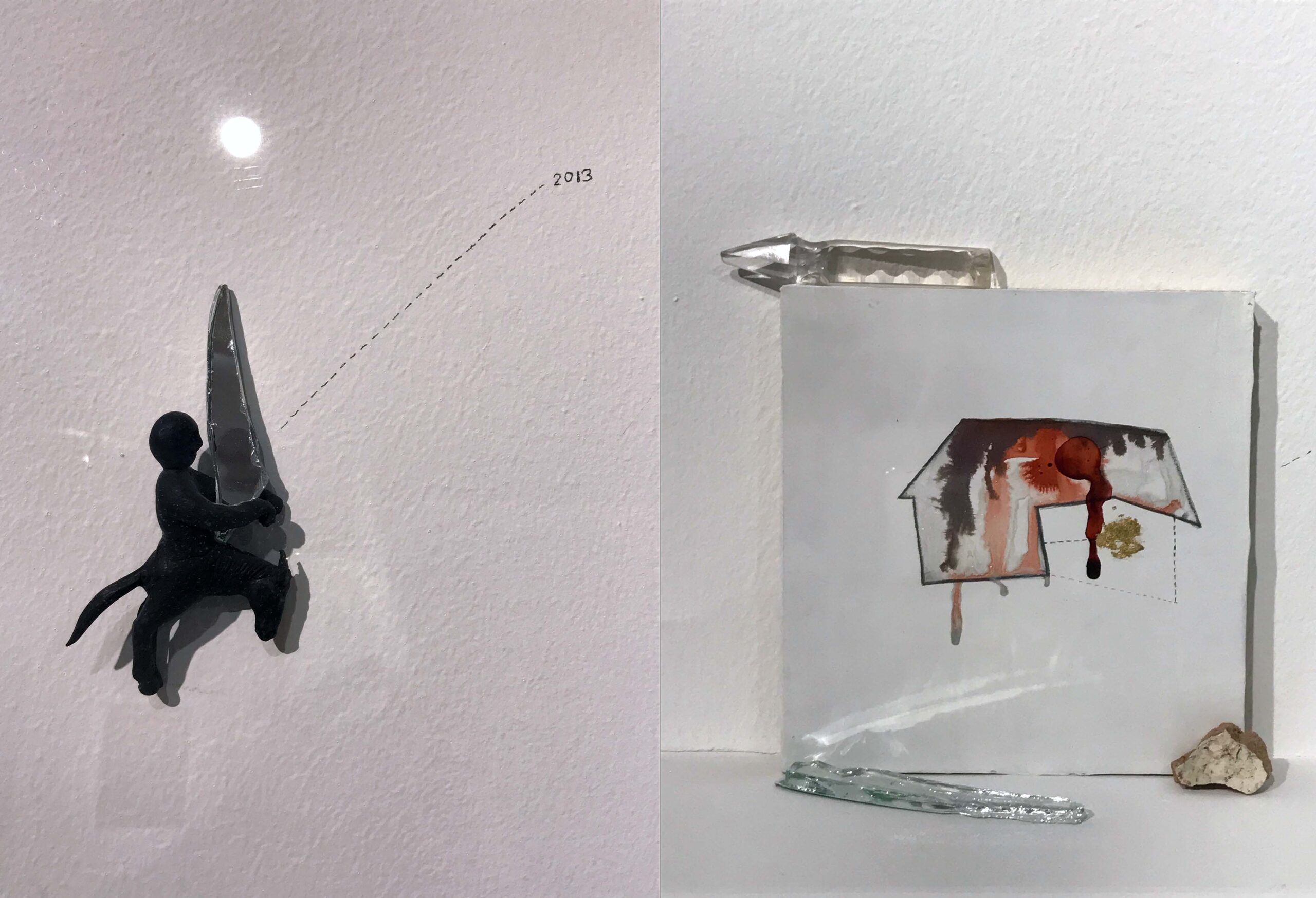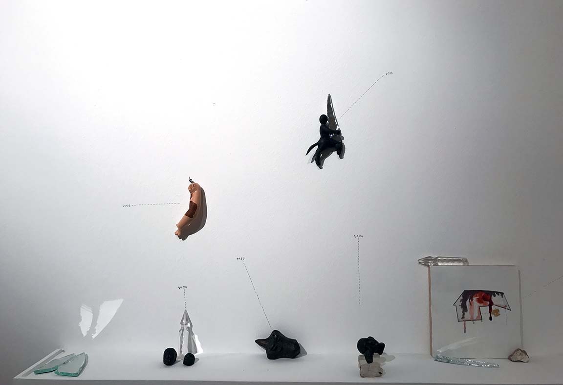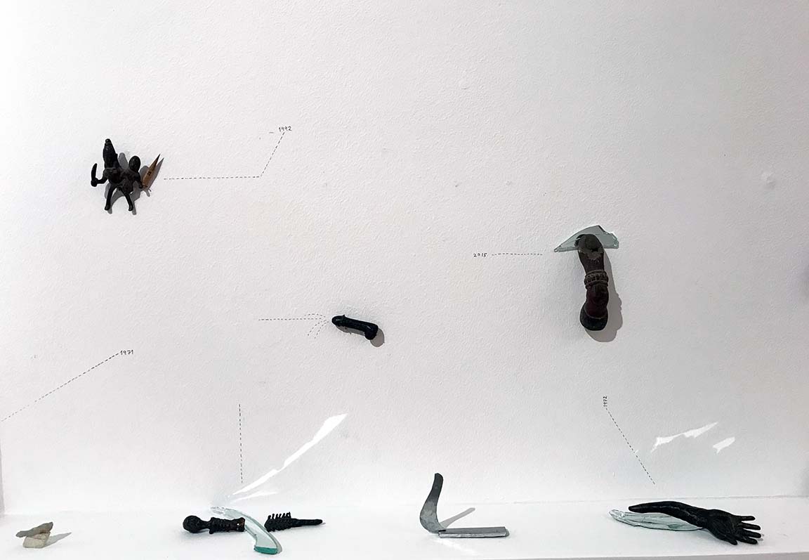 Installation with bronzes, found objects, wall drawing, gesso painting on board, and glass