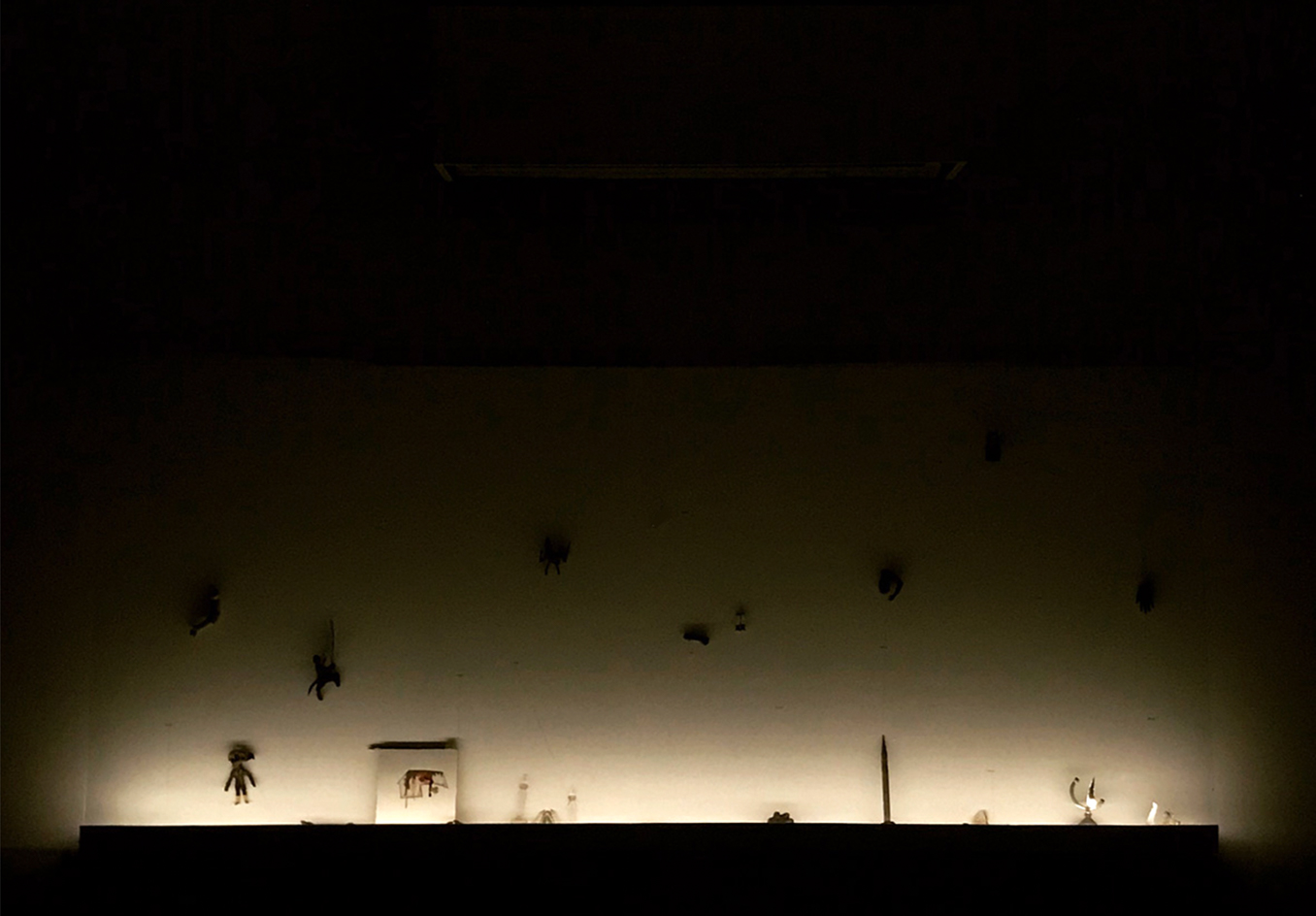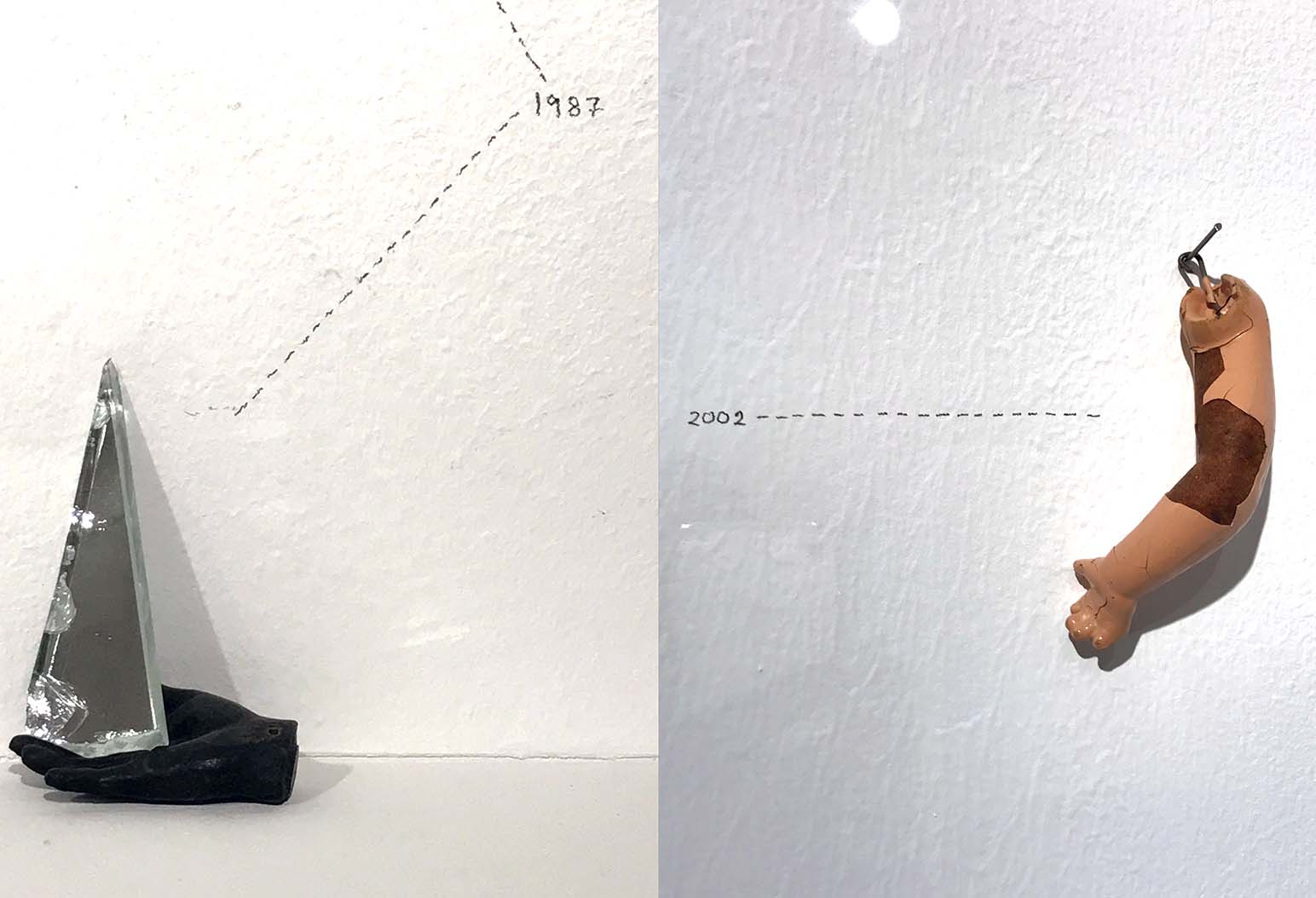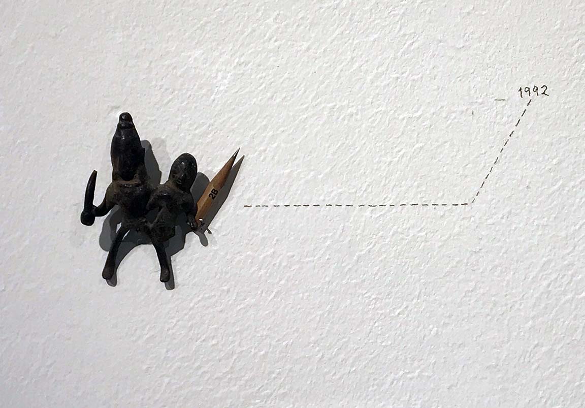 Installation with bronzes, found objects, wall drawing, gesso painting on board, and glass