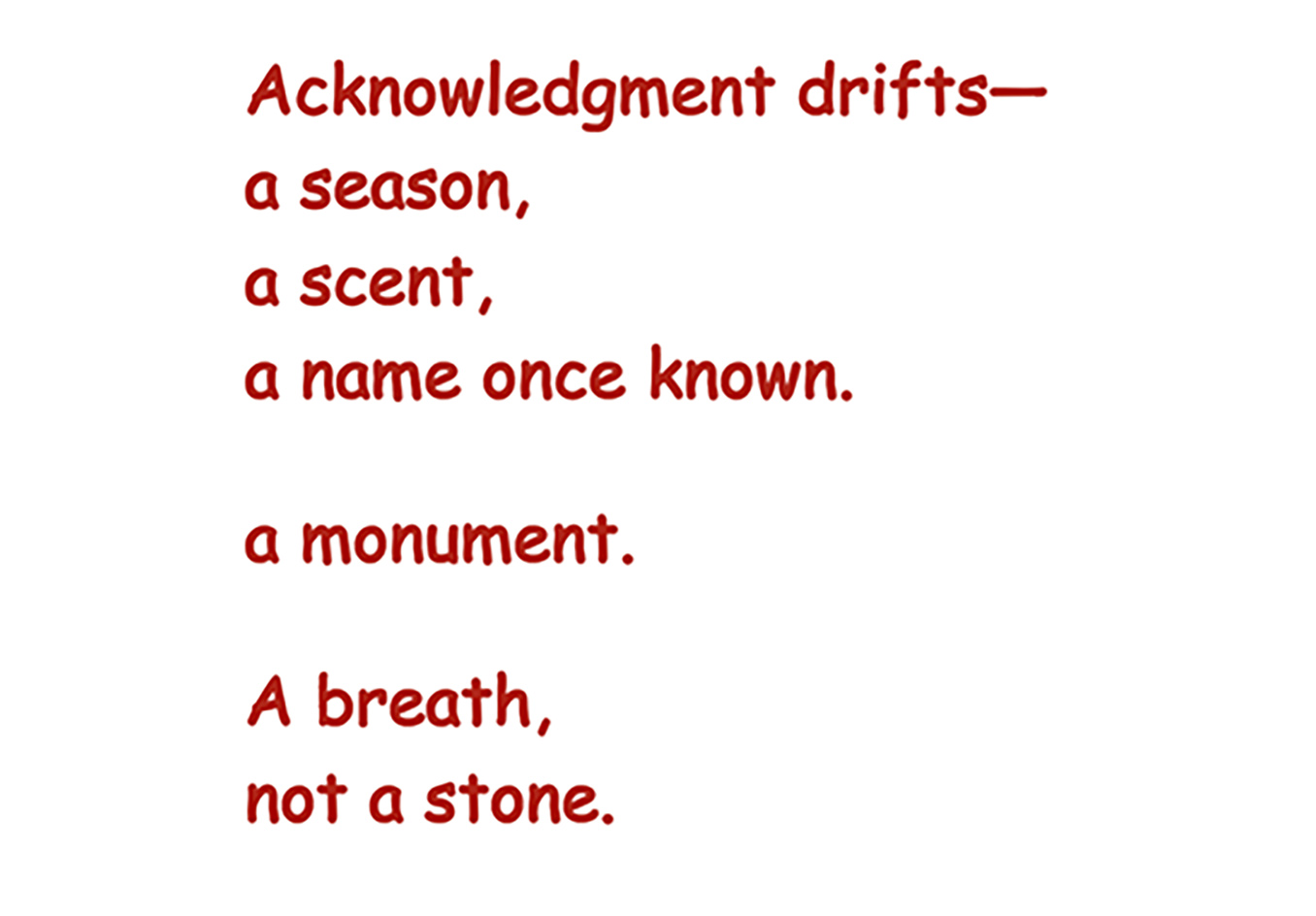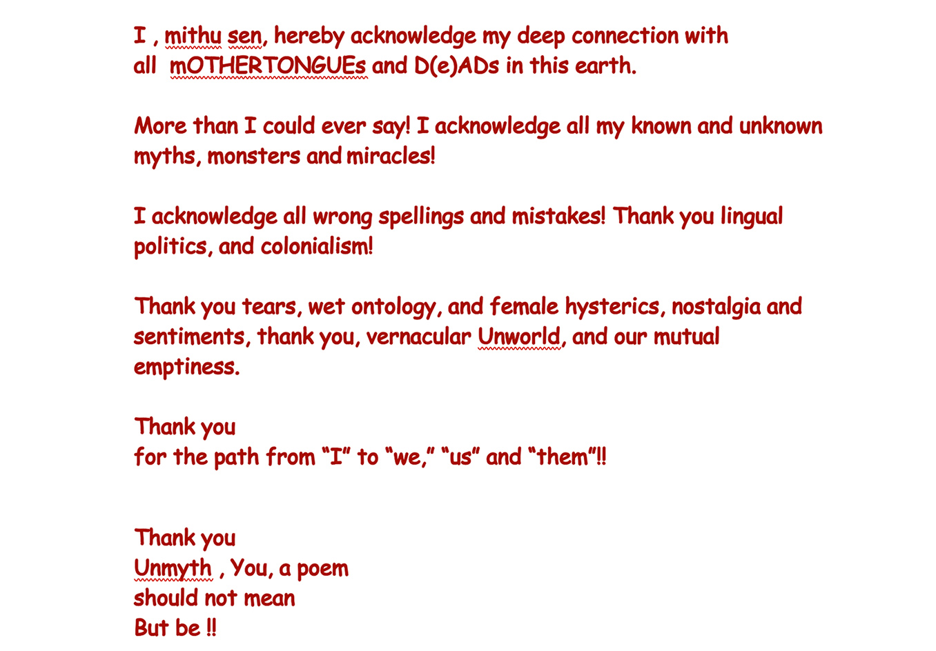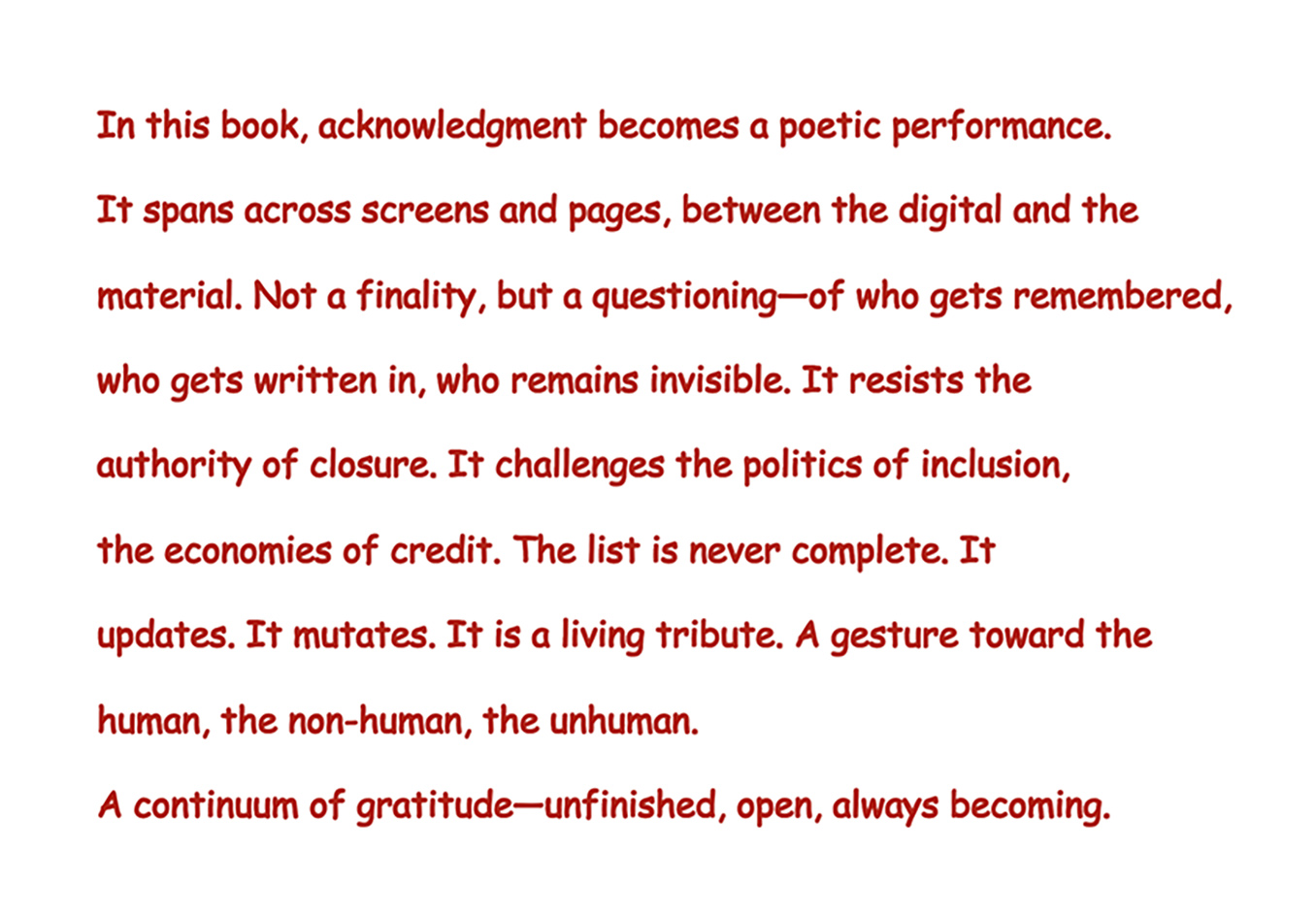 Acknowledgement is a conceptual space of becoming. a continuum of gratitude—unfinished, open, always becoming. This gesture is to destabilize traditional authorship by refusing fixity. It performs acknowledgment not as a footnote, but as a central, continuous act. Not a transactional closure, Refusing finality or fixity.. Allowing incompleteness and continual revision. Acknowledgement is like a checklist that defies hierarchy.….