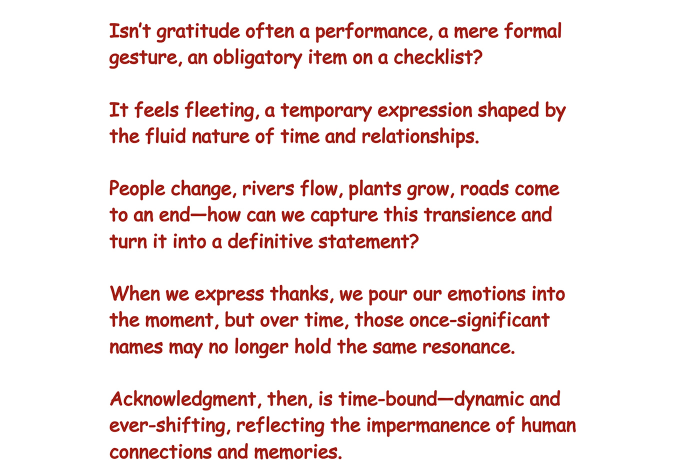 Who gets archived? Who gets named? Who remains unacknowledged. It is a relational field of co-creation and co-dependency. a living archive of relation—unfinished, unstable, and open-ended, and collective. This is not just gratitude—it is a radical gesture of love, resistance, and becoming. Isn’t gratitude often a performance, a mere formal gesture, an obligatory item on a checklist? It feels fleeting, a temporary expression shaped by the fluid nature of time and relationships. Aren’t there always some people or things who remain forgotten, overlooked, or overshadowed? People change, rivers flow, plants grow, roads come to an end—how can we capture this transience and turn it into a definitive statement? When we express thanks, we pour our emotions into the moment, but over time, those once-significant names may no longer hold the same resonance. Acknowledgment, then, is time-bound—dynamic and ever-shifting, reflecting the impermanence of human connections and memories.