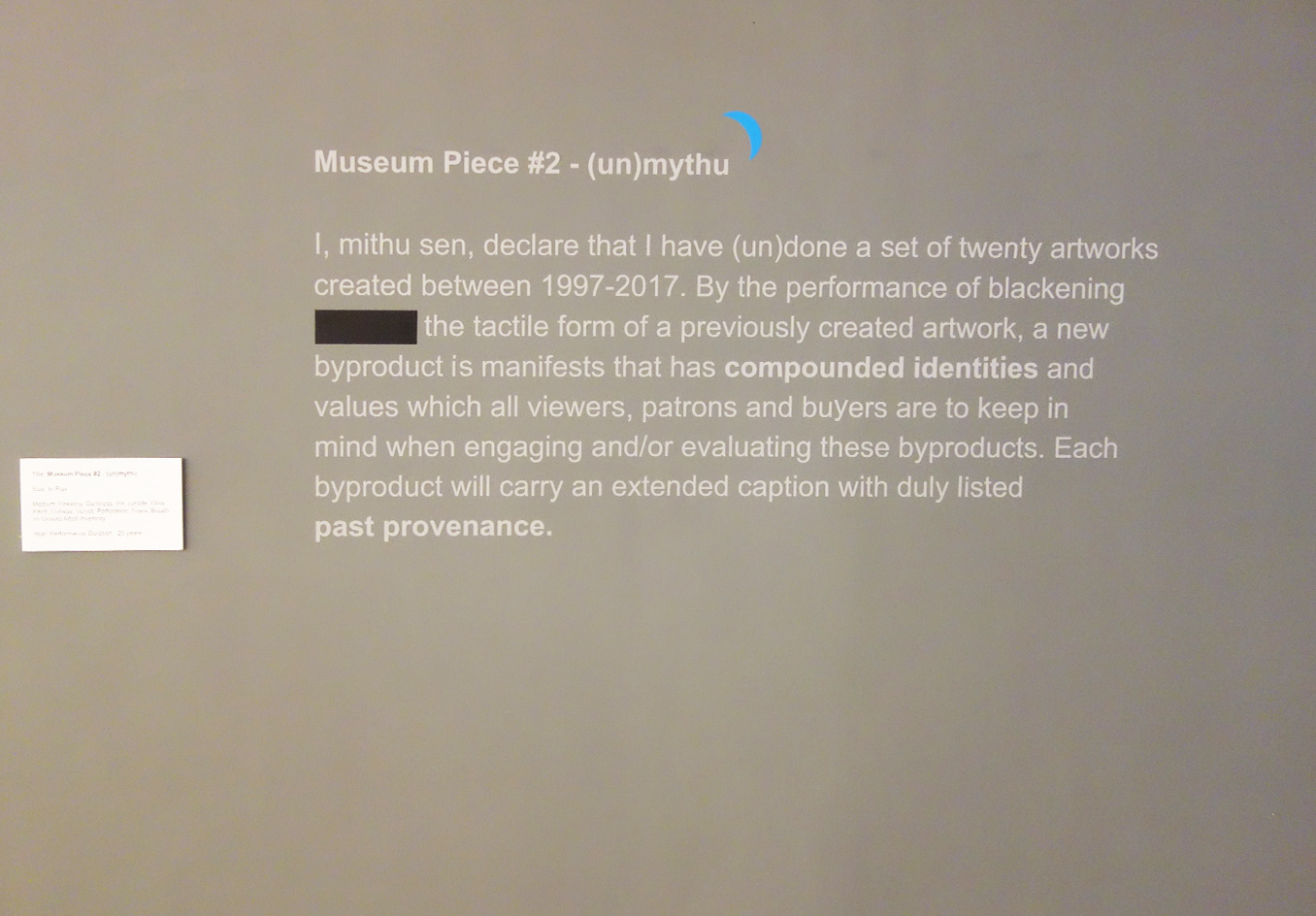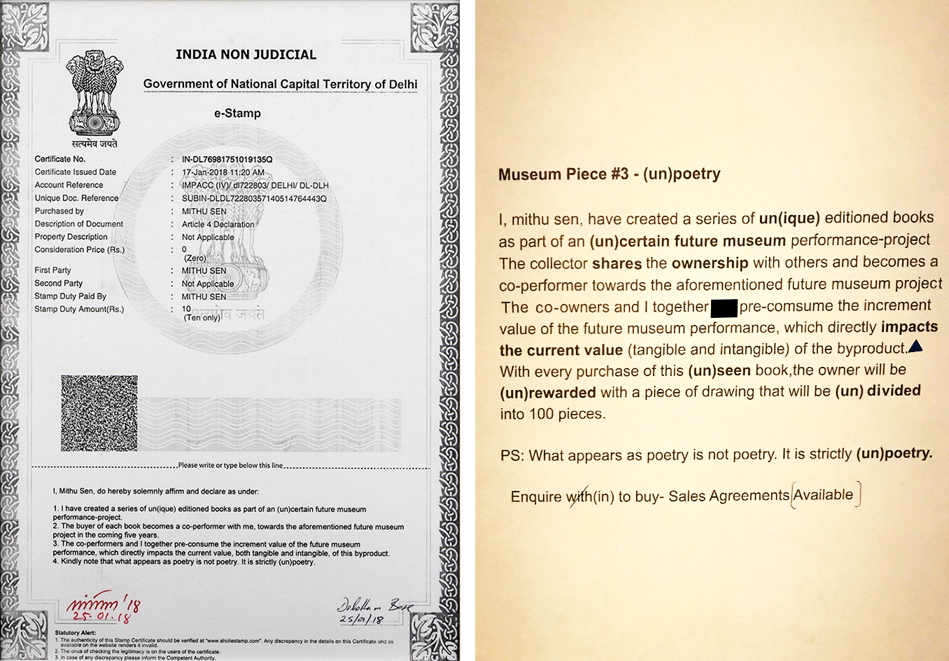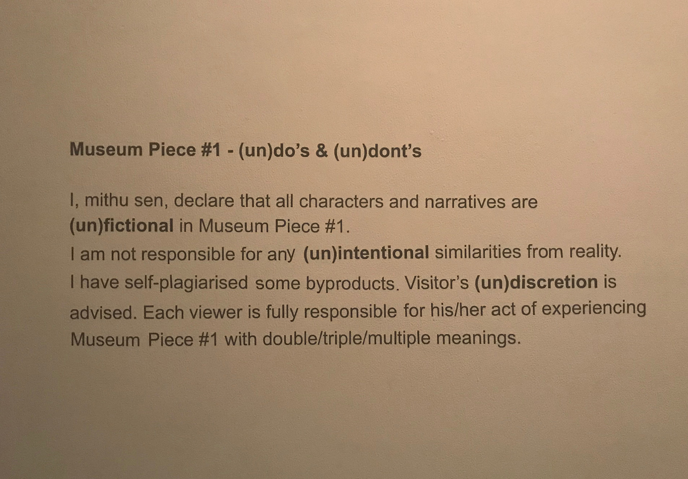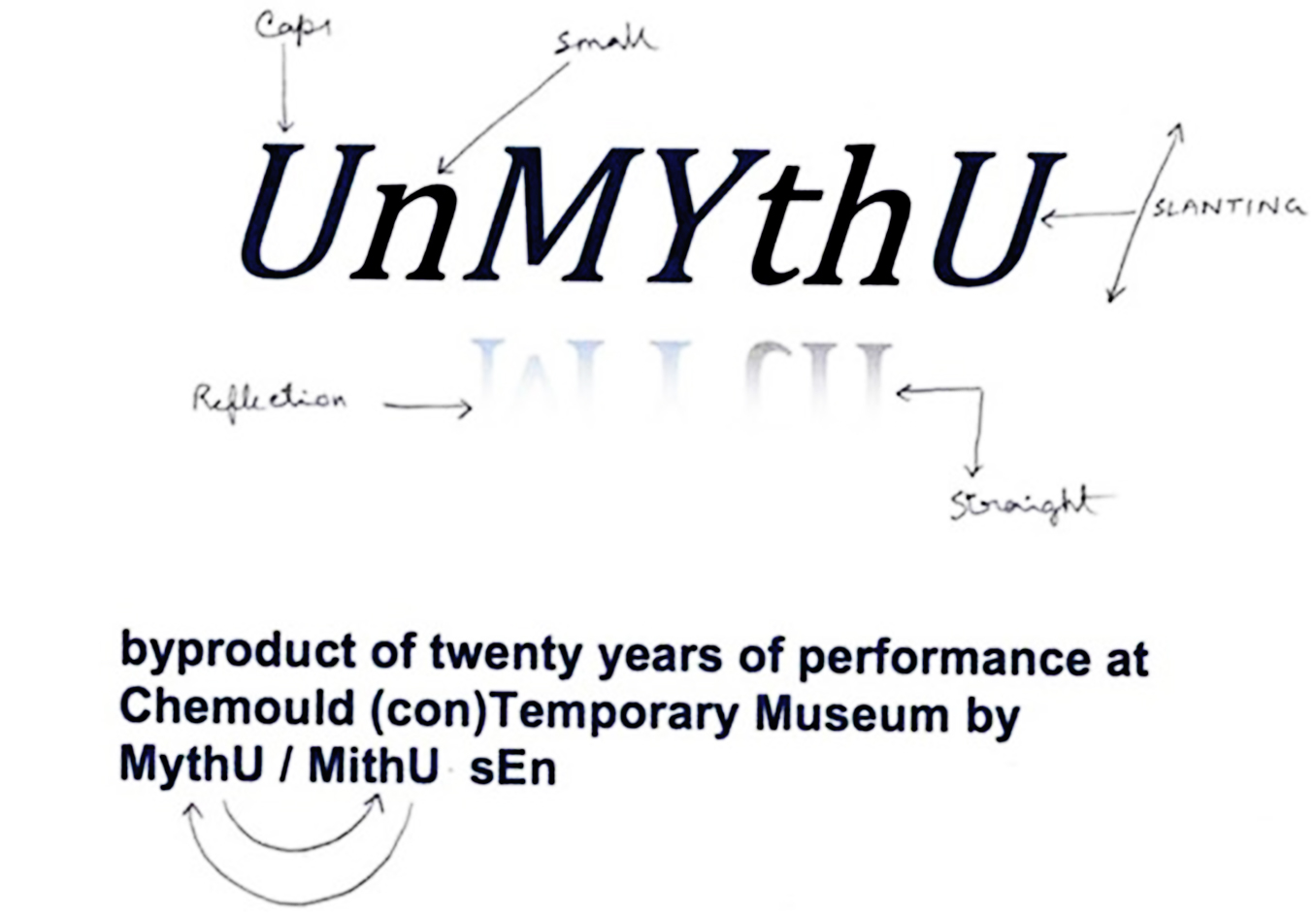 UnMYthU seeks to (un)present the artist’s practice through (un)frequented modes of engagement. The tangible manifestation of the exhibition is a byproduct of twenty years of performance. This museum exhibition is an exploration of performance of identities and the spaces of inbetweenness - especially in the context of contemporary value creation and value consumption, mythmaking as a method of identity building and the social roles we undertake and discard. Sen employs the medium of life and human experiences as the material for her performances. The resulting byproducts are physical remnants of performed identities- manifested through pre-codified cognition and sensory impulses and reactions. Sen invites visitors to co-perform and (un)myth with her, but under contractual mandatory protocol. All visitors are (un)performing with the performer(s) - together exploring the layers of their shared (con)temporary (un)realities that manifest existence(s).