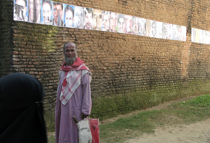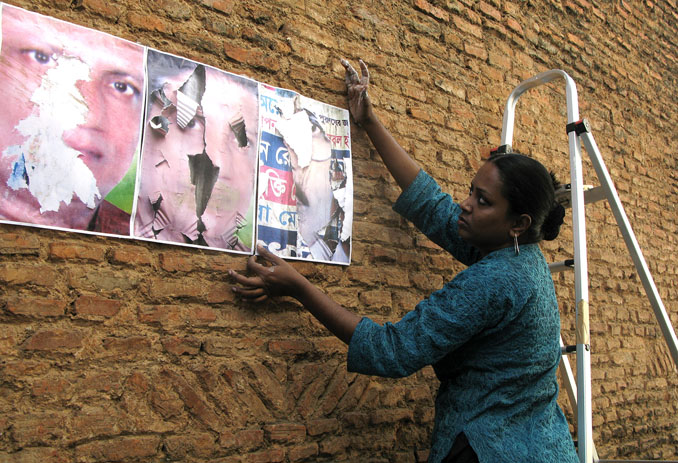 The torn posters of Bangladeshi Political leaders that had been disfigured by the angered voters became this site-specific installation’s central point. Re-touched and re-created, the posters were further pasted back onto the walls of the same village in Bangladesh.